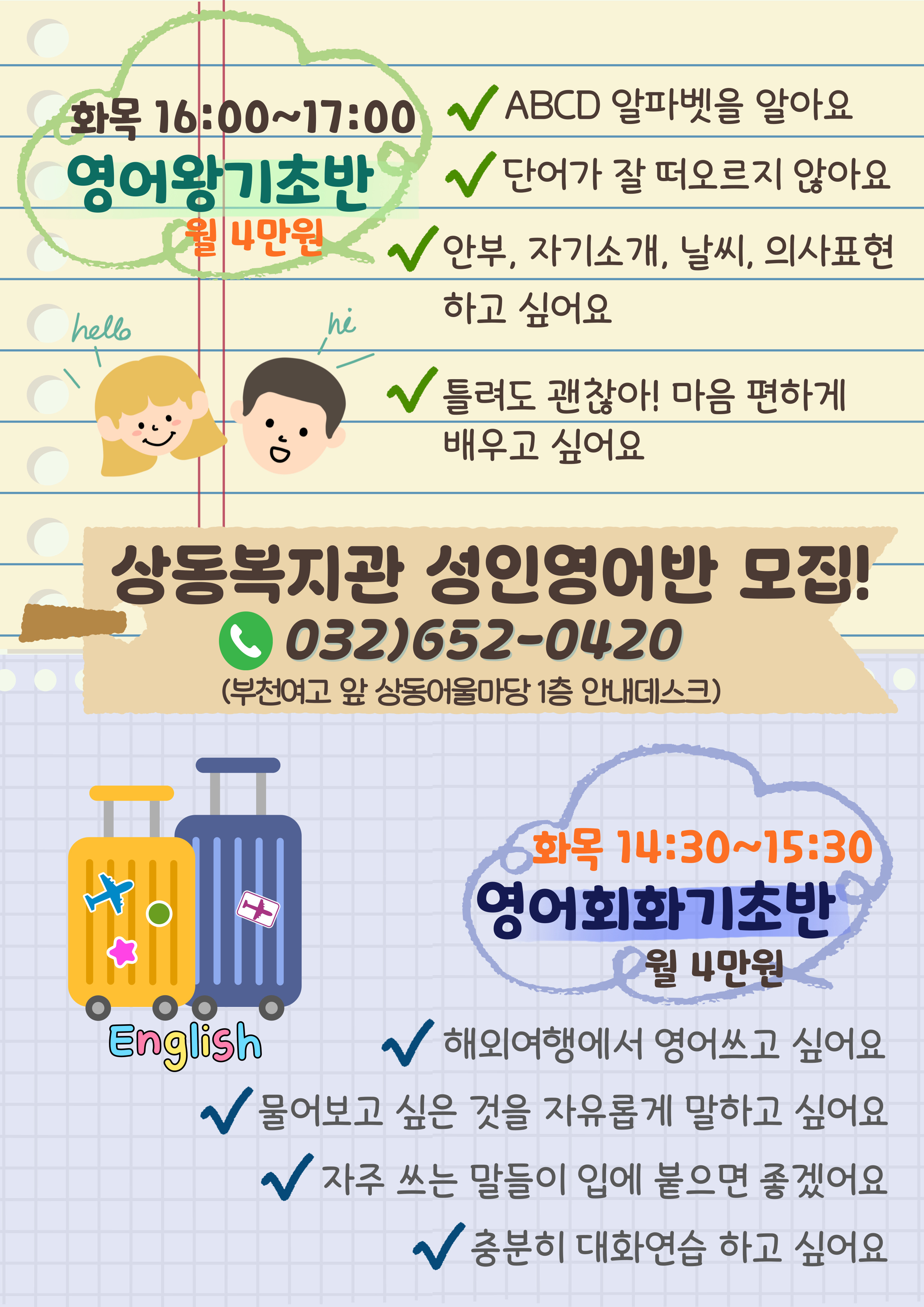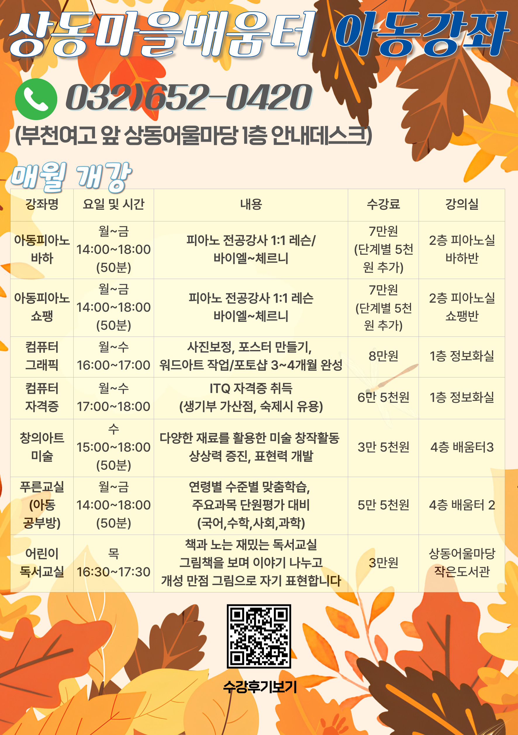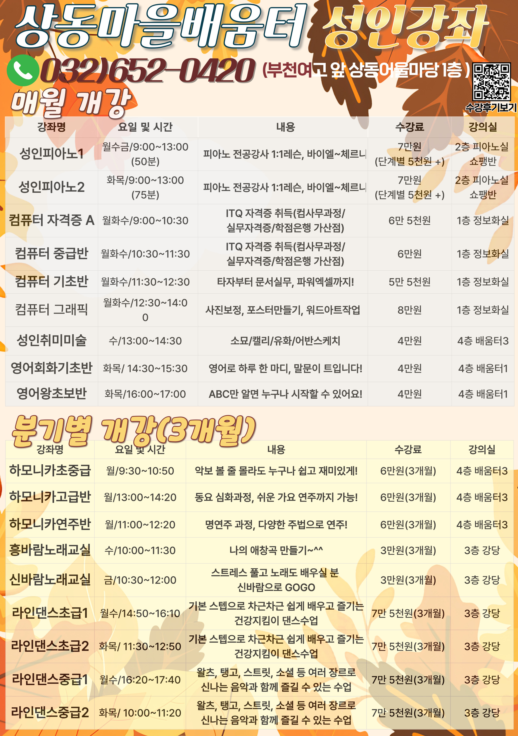 그러면서도 양질의 수업을 찾고 계시다면, 상동종합사회복지관 상동마을배움터에서 시작해보세요!