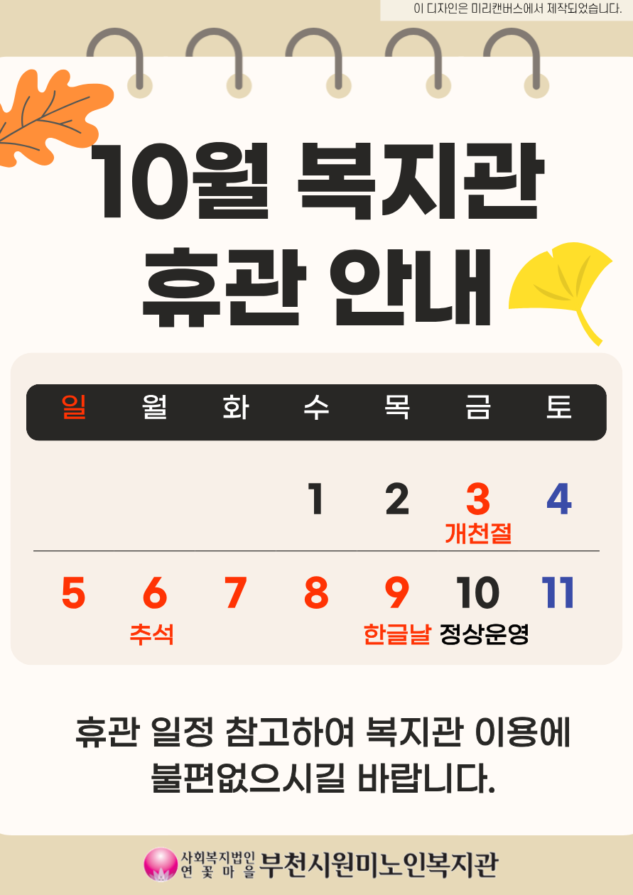 원미노인복지관 10월 휴관 안내
