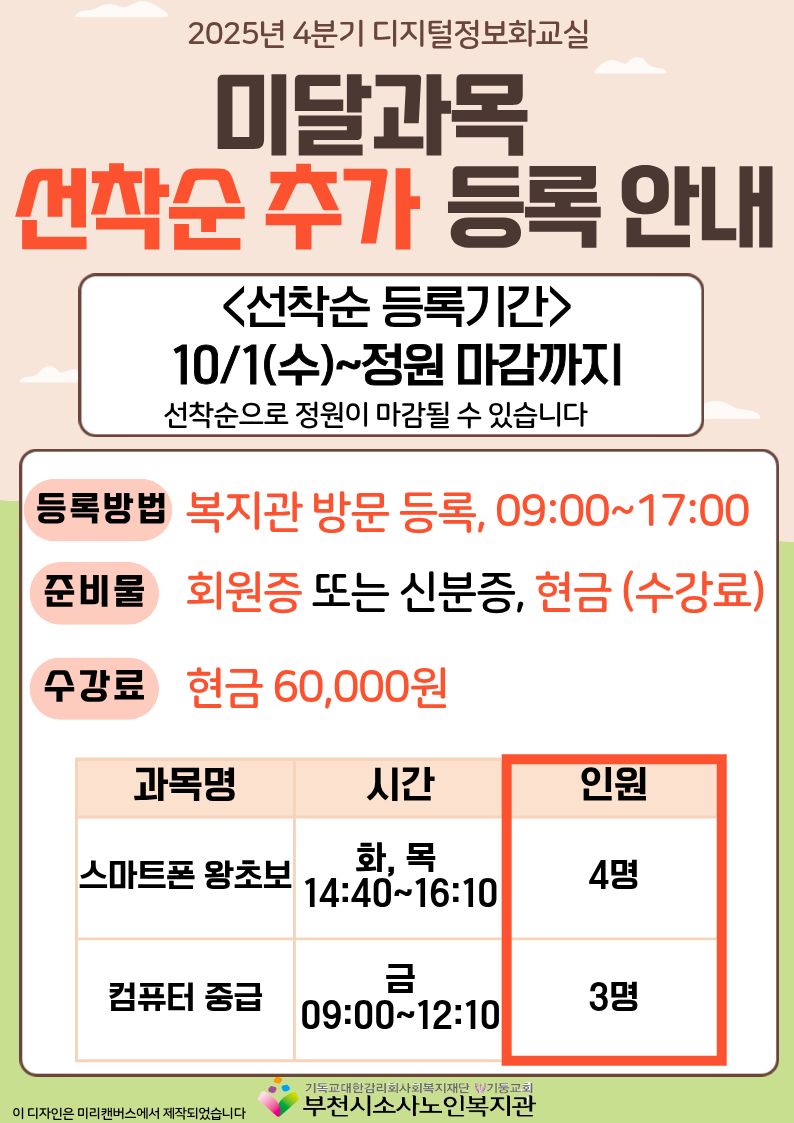[노년사회화교육사업] 2025년 4분기 디지털정보화교실 미달과목 선착순 추가 등록 안내