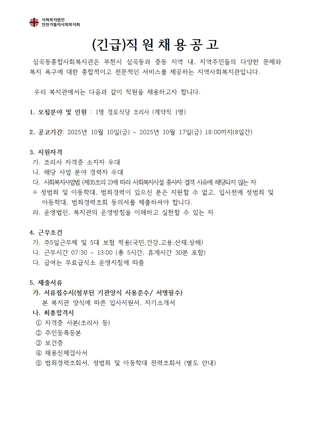(긴급)심곡동종합사회복지관 직원채용(무료급식소 취사원) 총1명