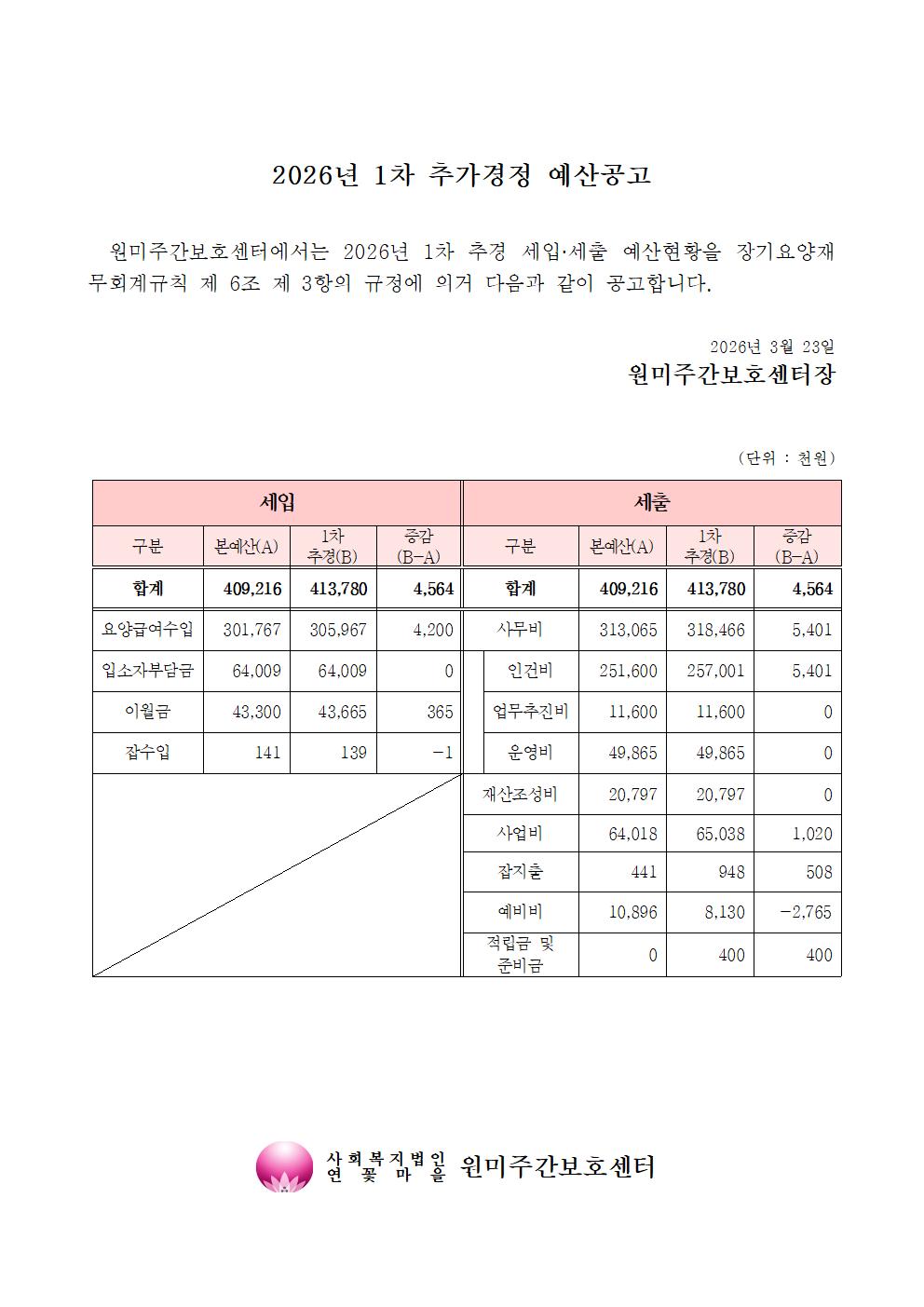 원미주간보호센터 2026년 1차 추가경정 예산 보고