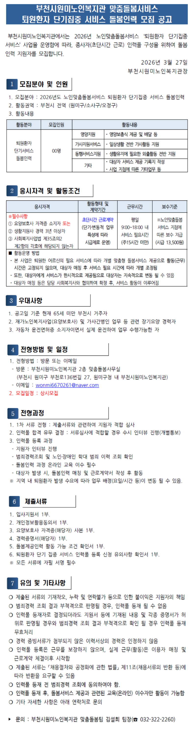 26년 노인맞춤돌봄서비스 퇴원환자 단기집중 돌봄인력 공고(부천시원미노인복지관_이력서 양식 포함).hwp