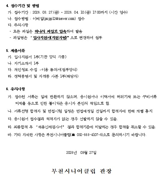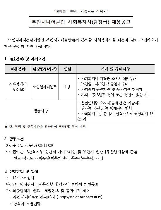 부천시니어클럽 직원 채용 공고(사회복지사_팀장급)