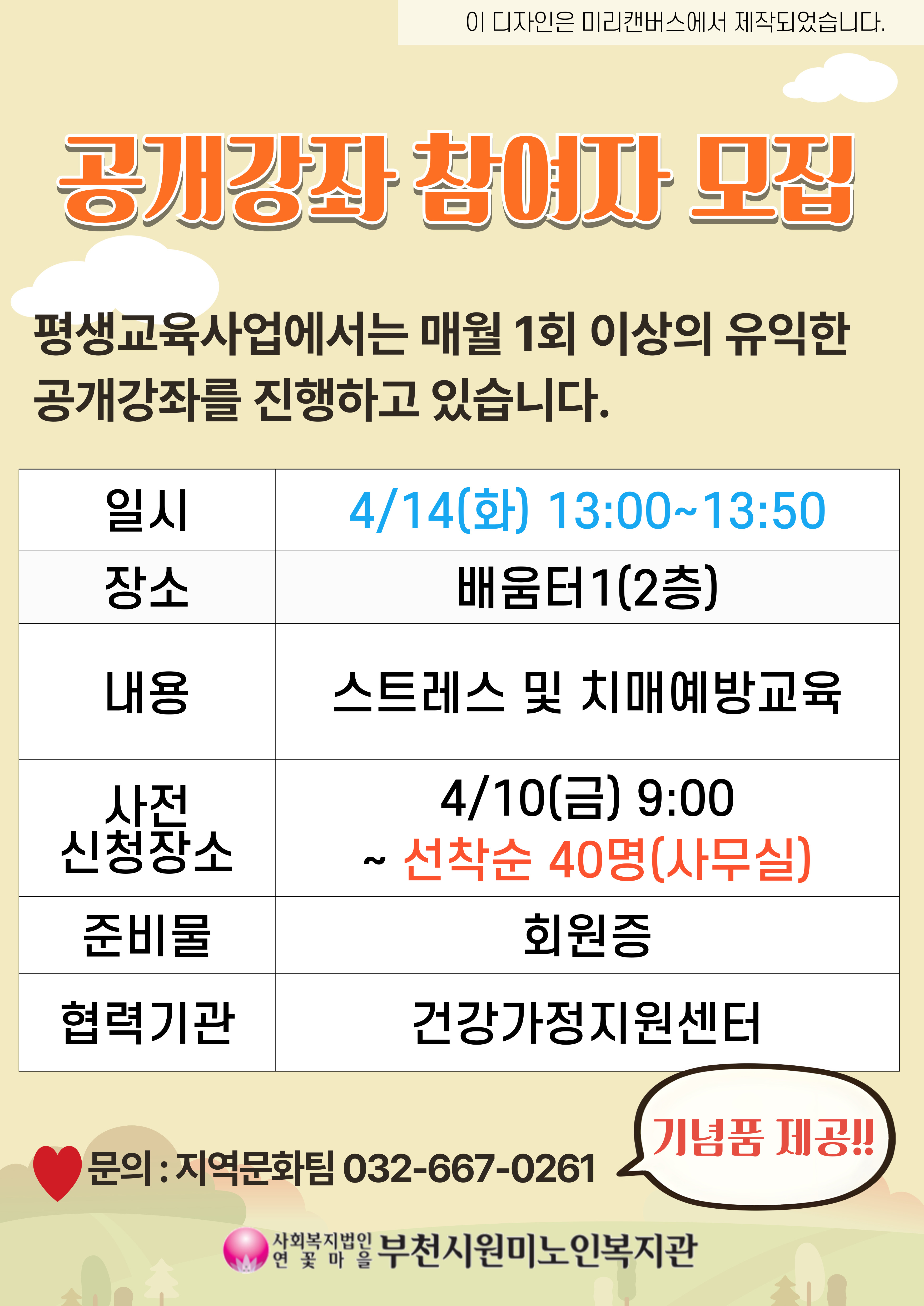 공개강좌 <스트레스 관리 및 치매예방교육>
