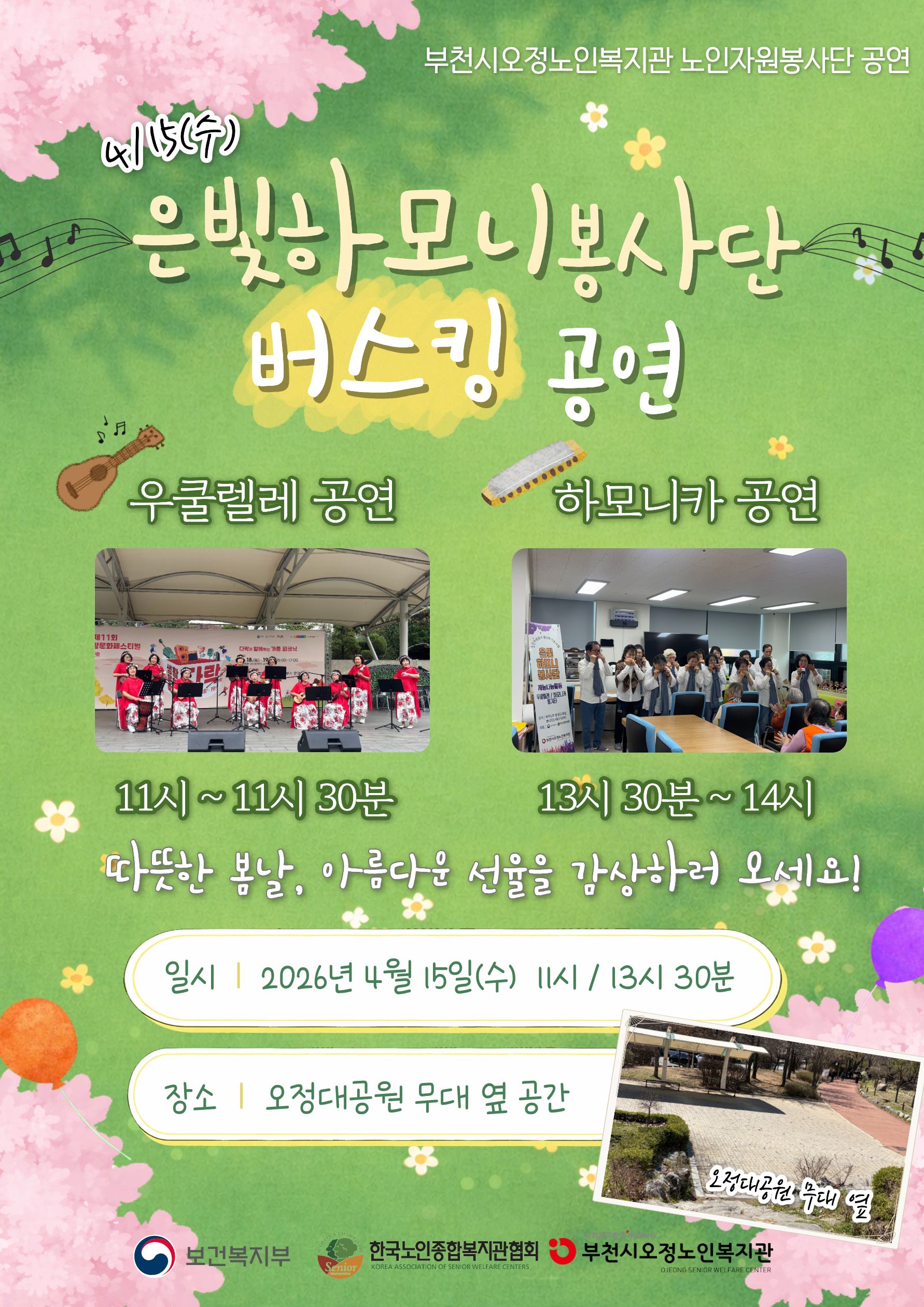 2026년 4월 15일(수) 11시(우쿨렐레 공연), 13시 30분(하모니카 공연)