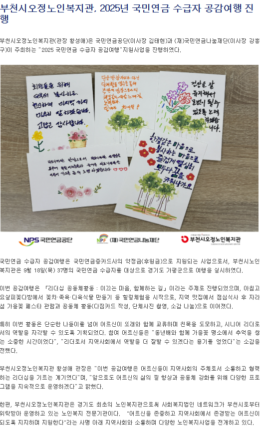 부천시오정노인복지관, 2025년 국민연금 수급자 공감여행 진행 - - IBS뉴스