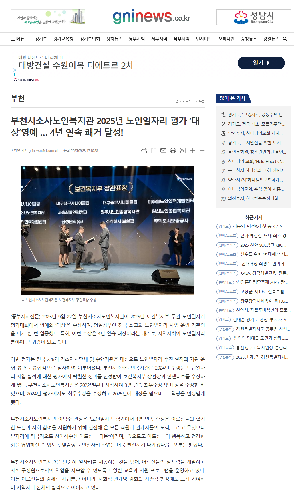 [중부시사신문]부천시소사노인복지관 2025년 노인일자리평가 '대상'
