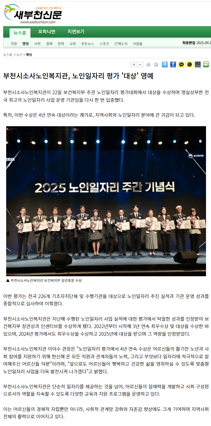 [새부천신문]부천시소사노인복지관 2025년 노인일자리평가 '대상'