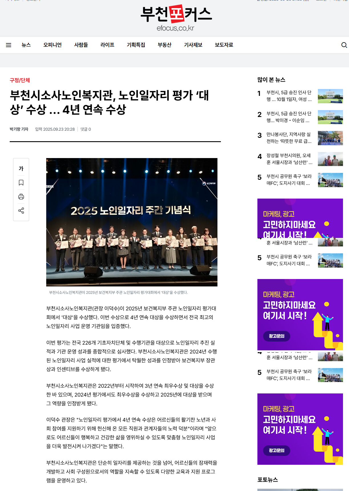 [부천포커스]부천시소사노인복지관 2025년 노인일자리평가 '대상'