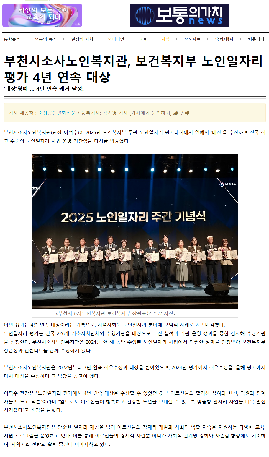 [보통의가치]부천시소사노인복지관 2025년 노인일자리평가 '대상'