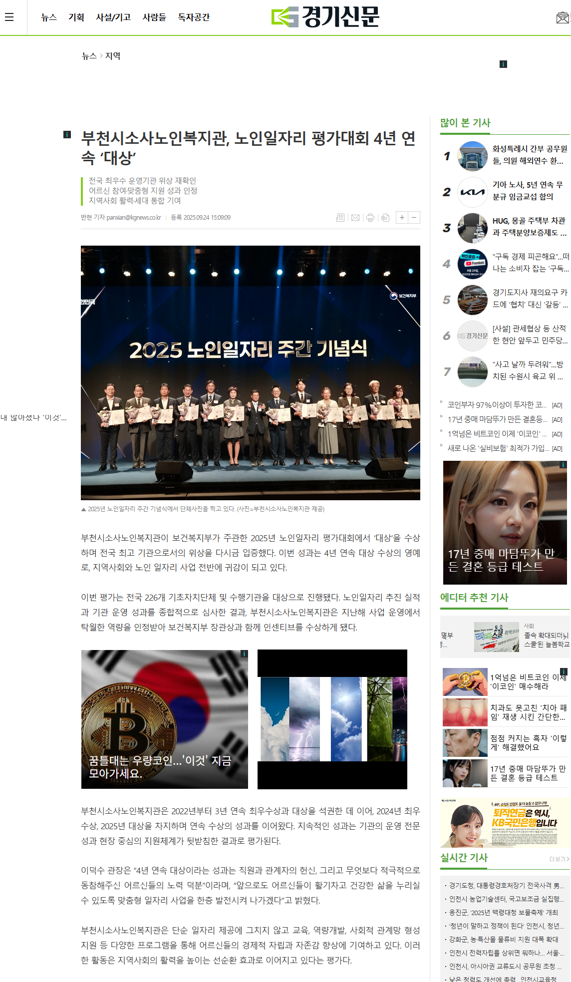 [경기신문]부천시소사노인복지관 2025년 노인일자리평가 '대상'