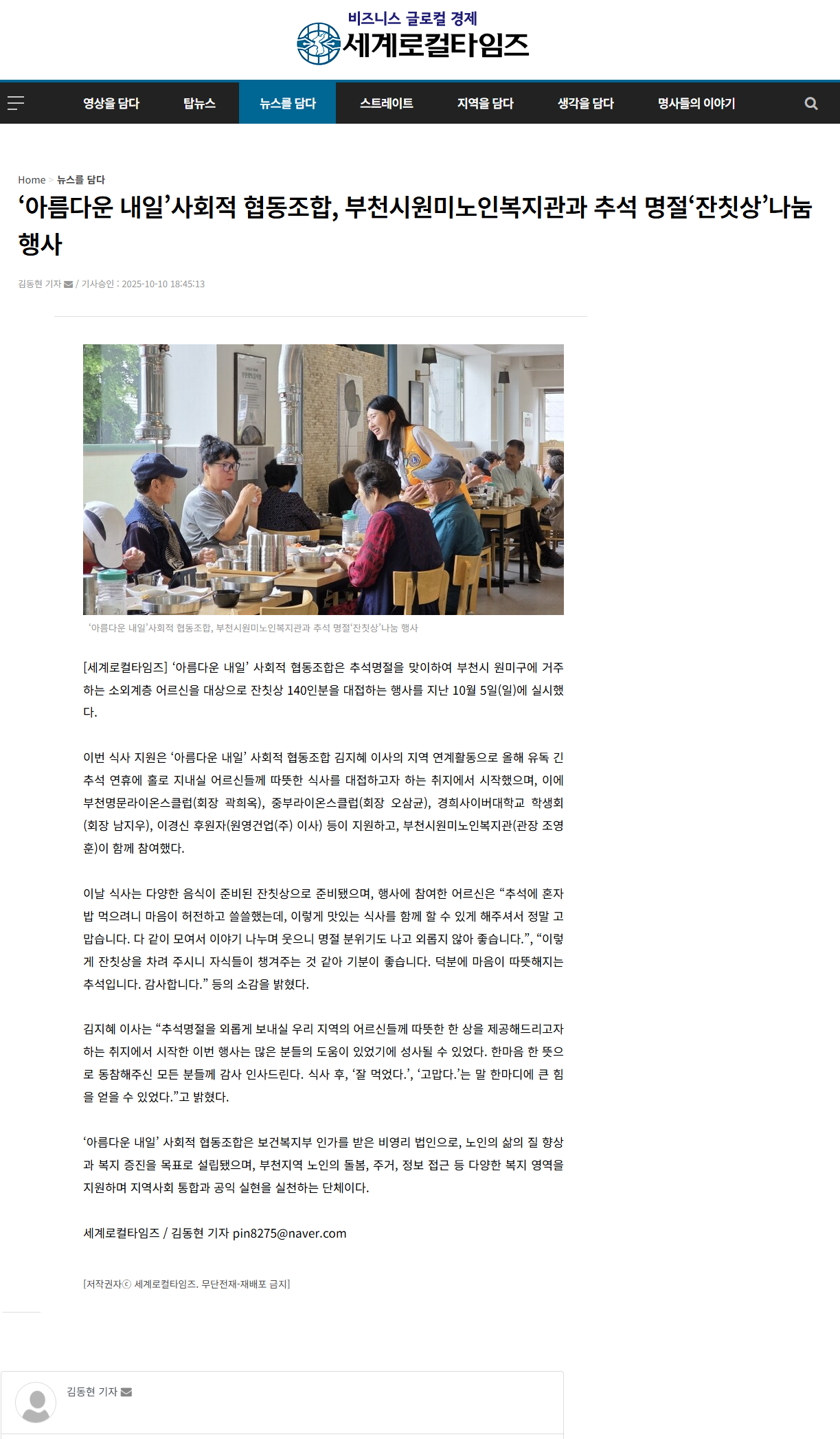 [세계로컬타임즈] '아름다운 내일' 사회적 협동조합, 부천시원미노인복지관과 추석 명절 '잔칫상'나눔 행사