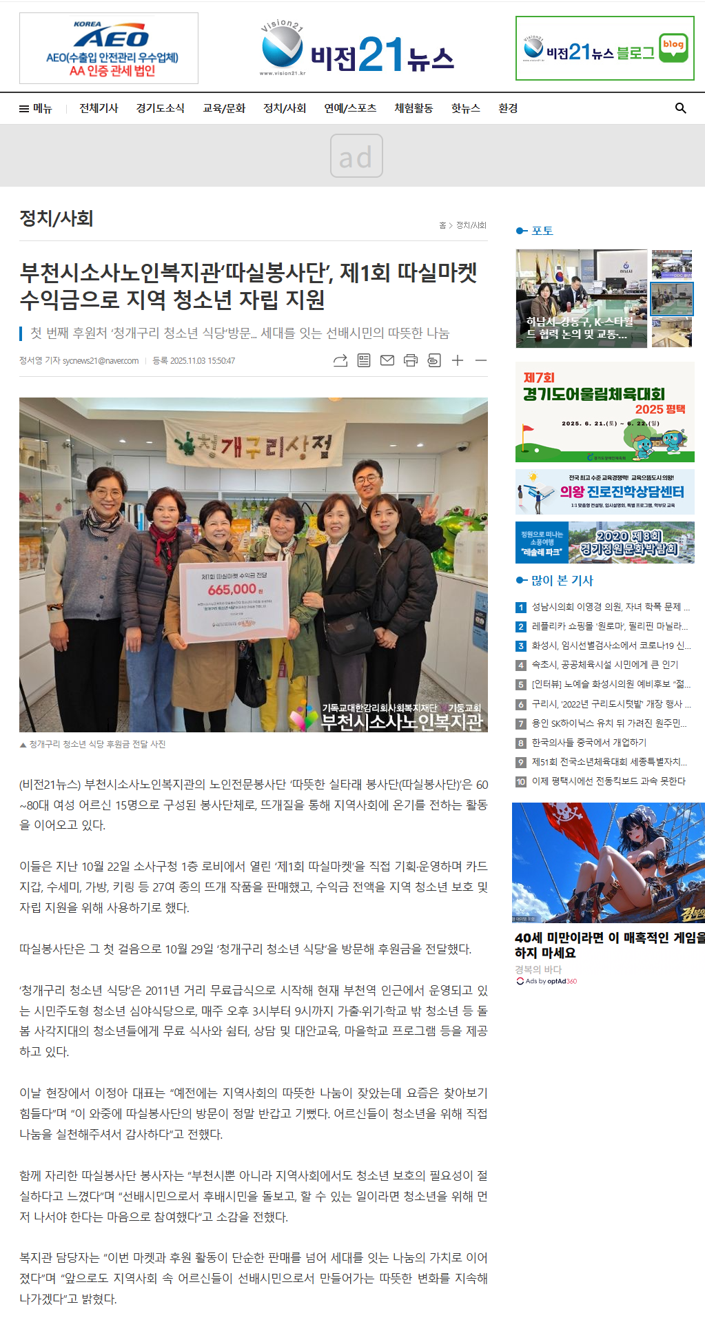 [비전21뉴스]부천시소사노인복지관 '따실봉사단' 제1회 따실마켓 수익금으로 지역 청소년 자립 지원