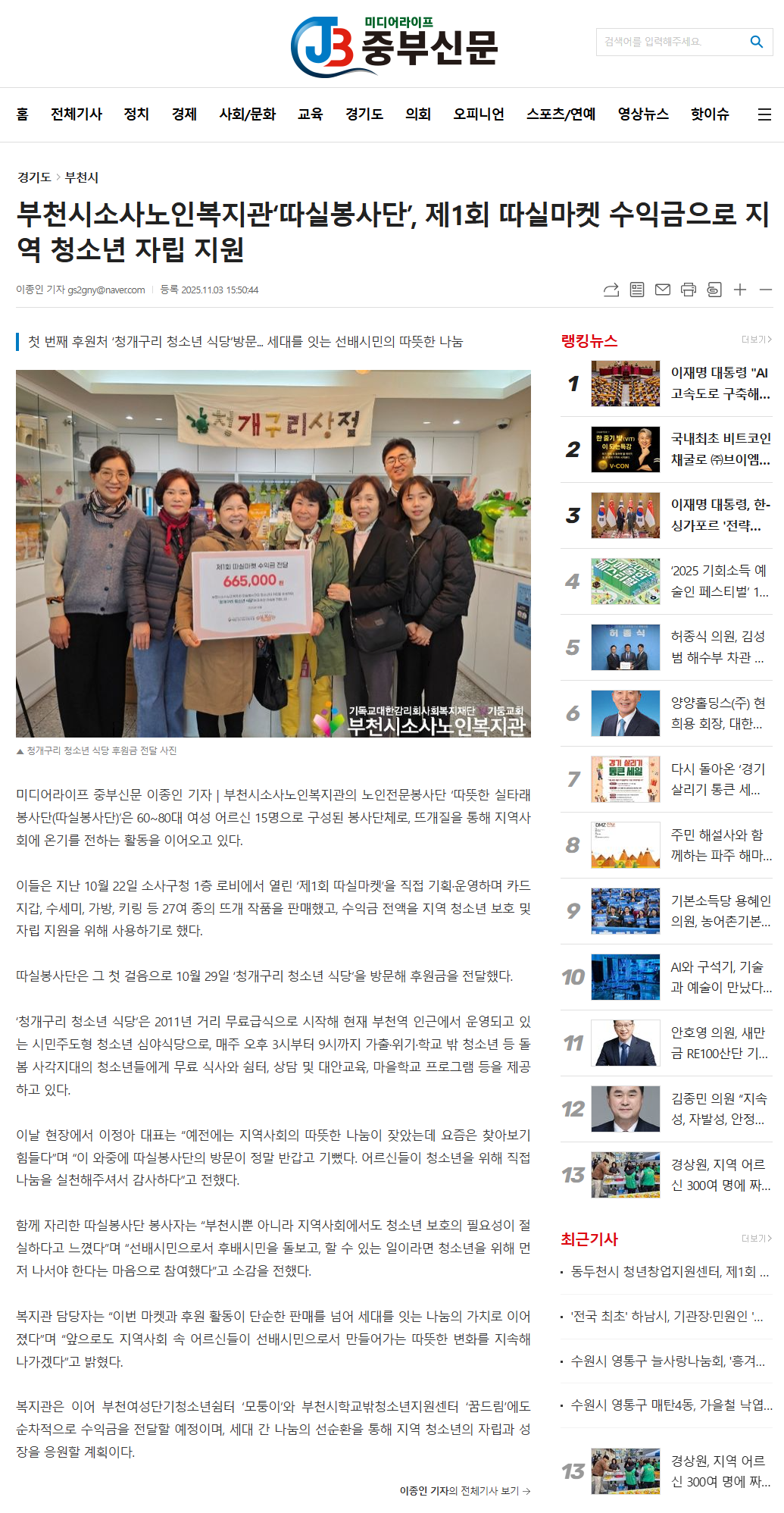 [중부신문]부천시소사노인복지관 '따실봉사단' 제1회 따실마켓 수익금으로 지역 청소년 자립 지원