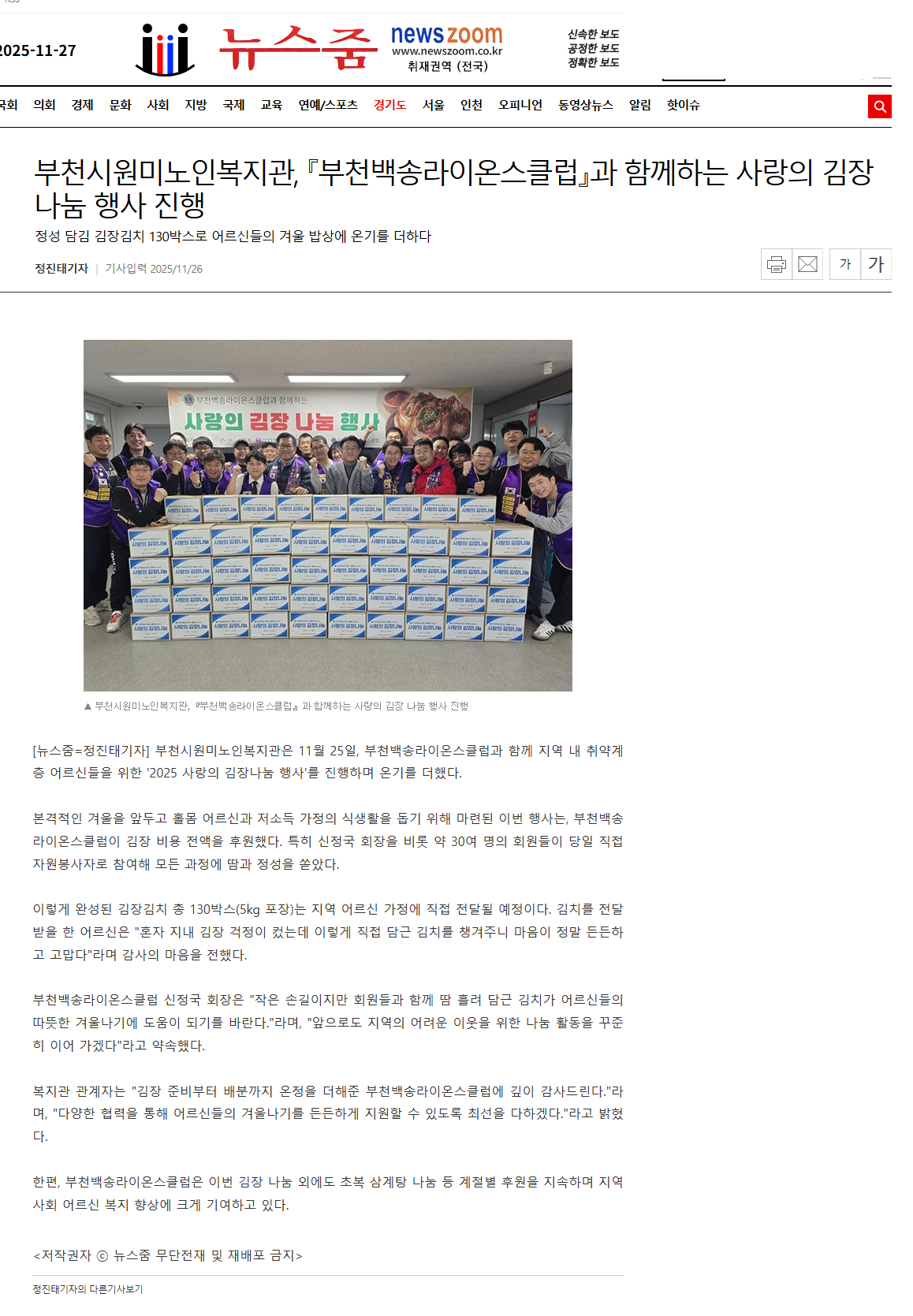 [뉴스줌] 부천시원미노인복지관, 부천백송라이온스클럽과 함께하는 사랑의 김장 나눔 행사 진행