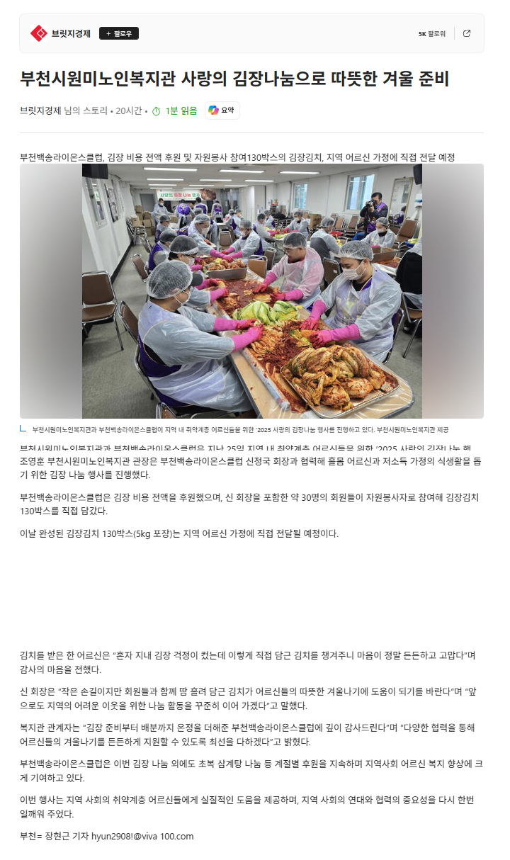 [부천굴포항 뉴스] 부천시원미노인복지관, 부천백송라이온...