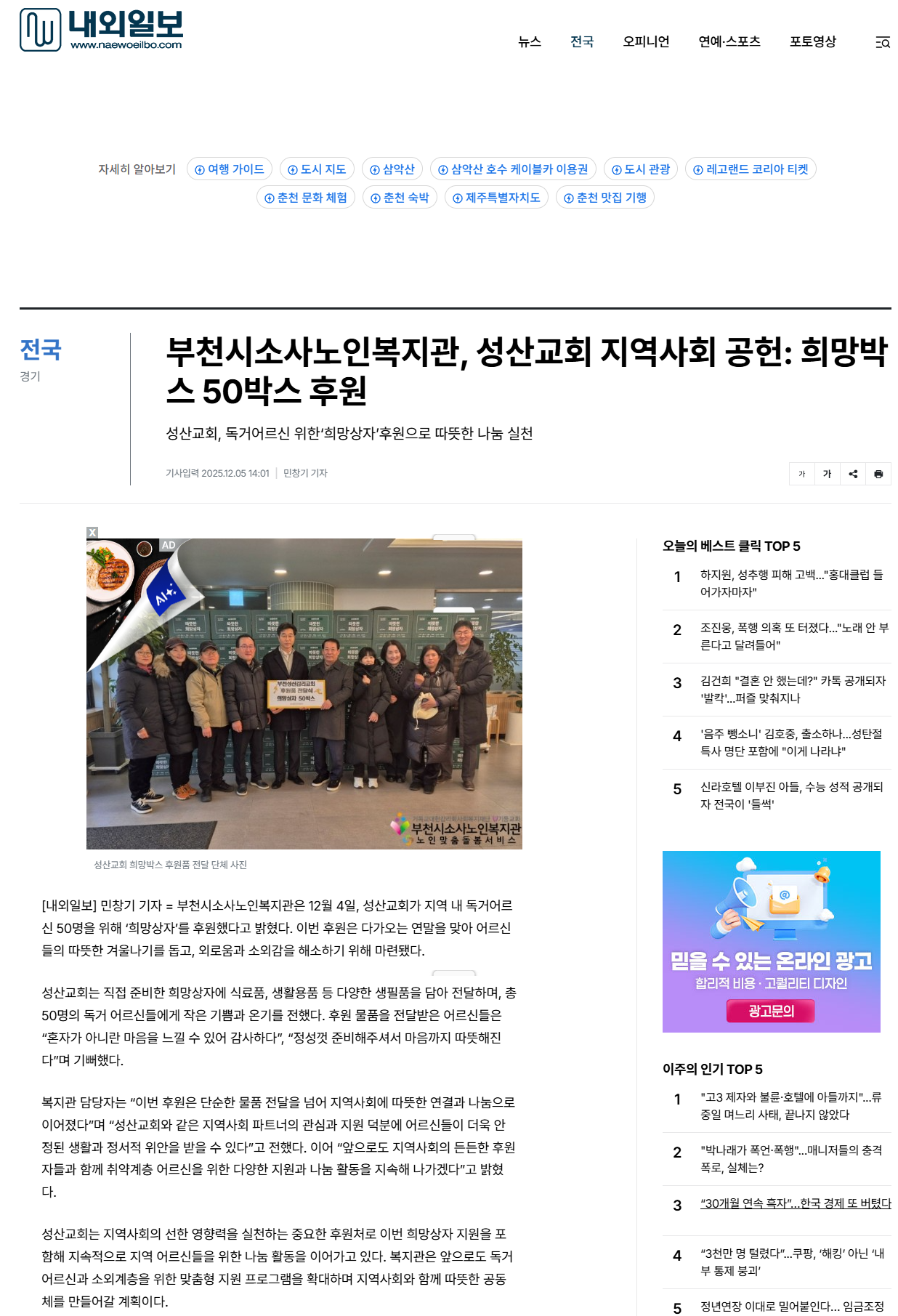 [새부천신문]성산교회, 독거어르신 위한 희망상자 후원