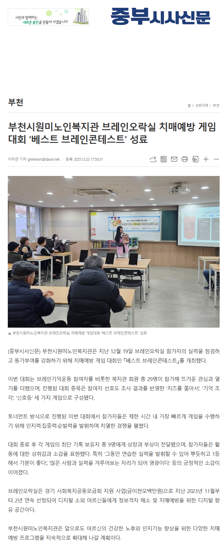 [뉴스줌] 부천시원미노인복지관 브레인오락실 치매예방게임...