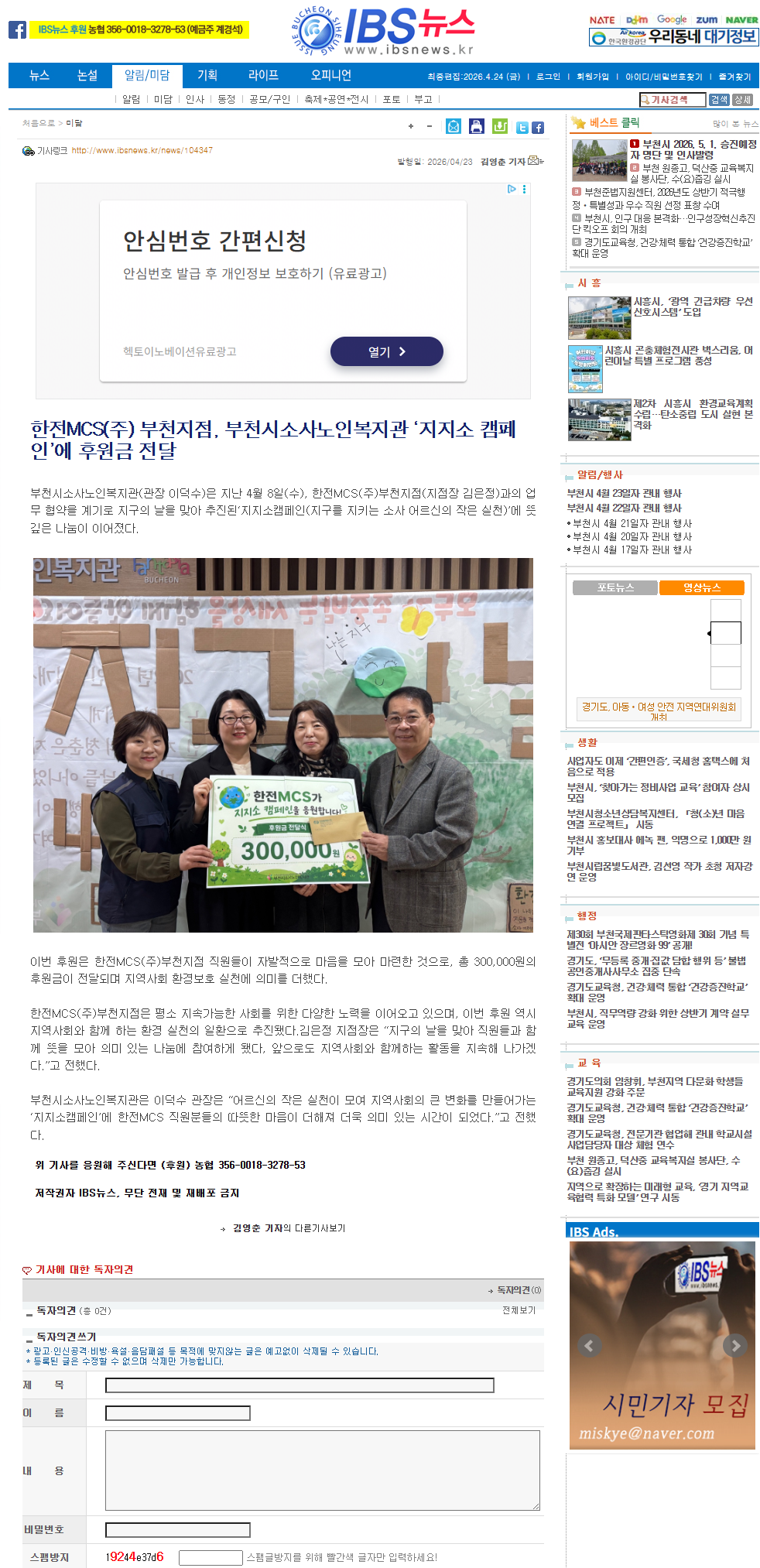 [IBS뉴스]부천시소사노인복지관, 지지소 캠페인에 한전 MCS(주) 부천지점 후원금 전달