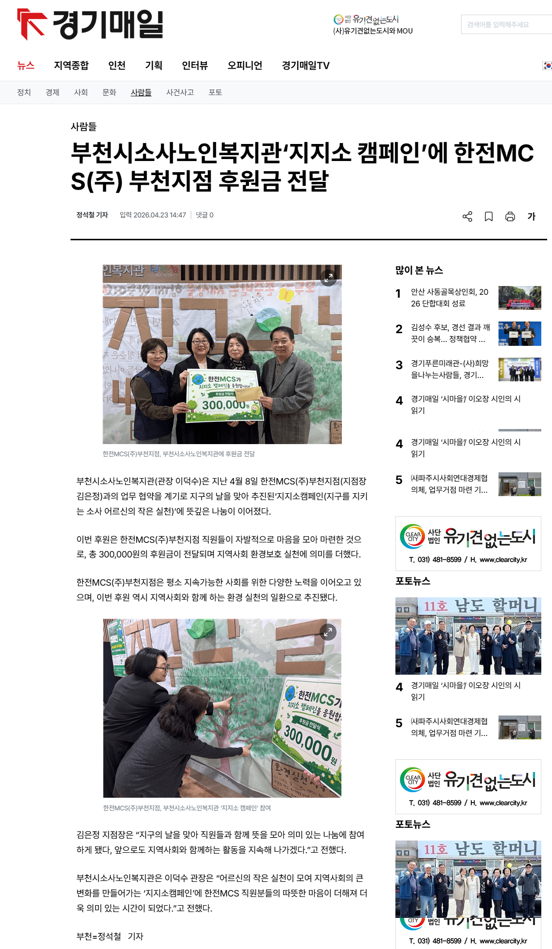 [경기매일]부천시소사노인복지관, 지지소 캠페인에 한전 MCS(주) 부천지점 후원금 전달