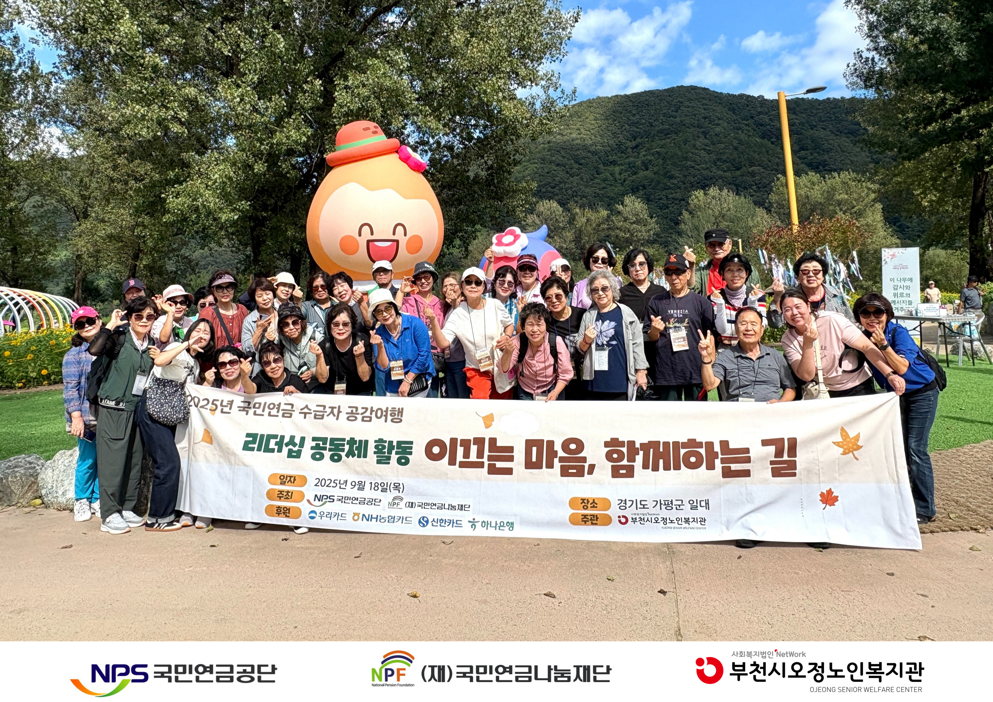 국민연금 수급자 공감여행은 국민연금증카드사의 약정금(후원금)으로 지원되는 사업으로서, 부천시노인복지관은 9월 18일(목) 37명의 국민연금 수급자를 대상으로 경기도 가평군으로 여행을 실시하였습니다.