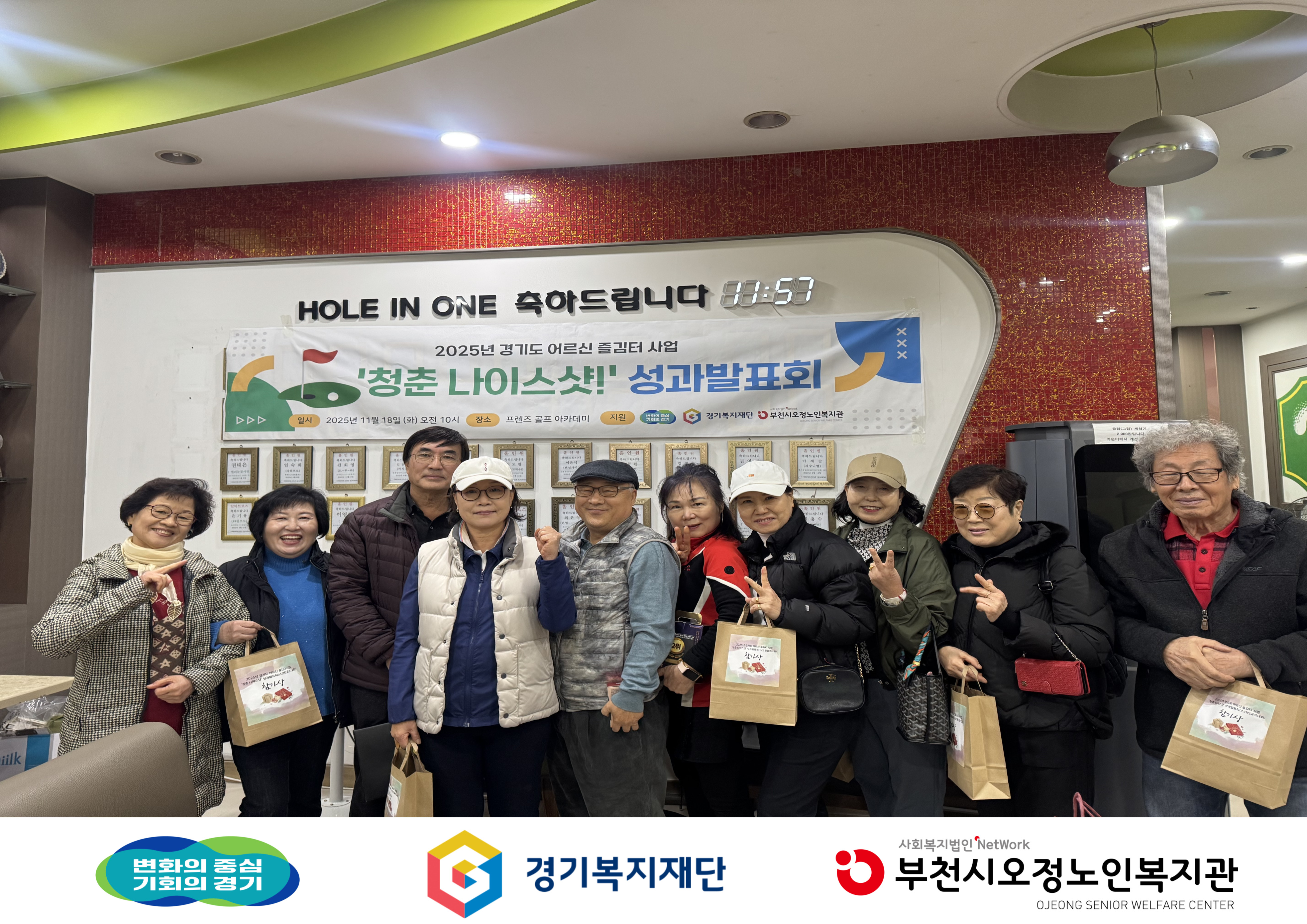평생교육팀에서는 6월부터 11월까지 경기도 어르신 즐김터 사업으로 ‘청춘 나이스샷!’ 골프 프로그램을 진행했습니다. 전문 강사와 함께한 골프 레슨, 개인 역량 강화를 위한 연습, 어르신 주도의 골프 동아리 활동까지 총 6개월간 알찬 활동이 이어졌습니다. 프로그램의 성과공유회로 스크린 골프 대회를 개최하여 그동안 갈고닦은 실력을 마음껏 뽐내는 시간을 가졌습니다. 경기 결과 1·2·3위도 선정하여 성과를 함께 축하했습니다. 앞으로도 어르신들이 건강하게 즐길 수 있는 여가 활동을 확대하고, 지속적인 동아리 활동을 통해 관계가 이어질 수 있도록 지원하겠습니다. -일시: 11월 18일 (화) 10:00~14:00 -장소: 프렌즈골프아카데미 -대상: 참여자 10명 -내용: 스크린골프대회 진행 -문의: 복지1과 평생교육팀 032-683-9290