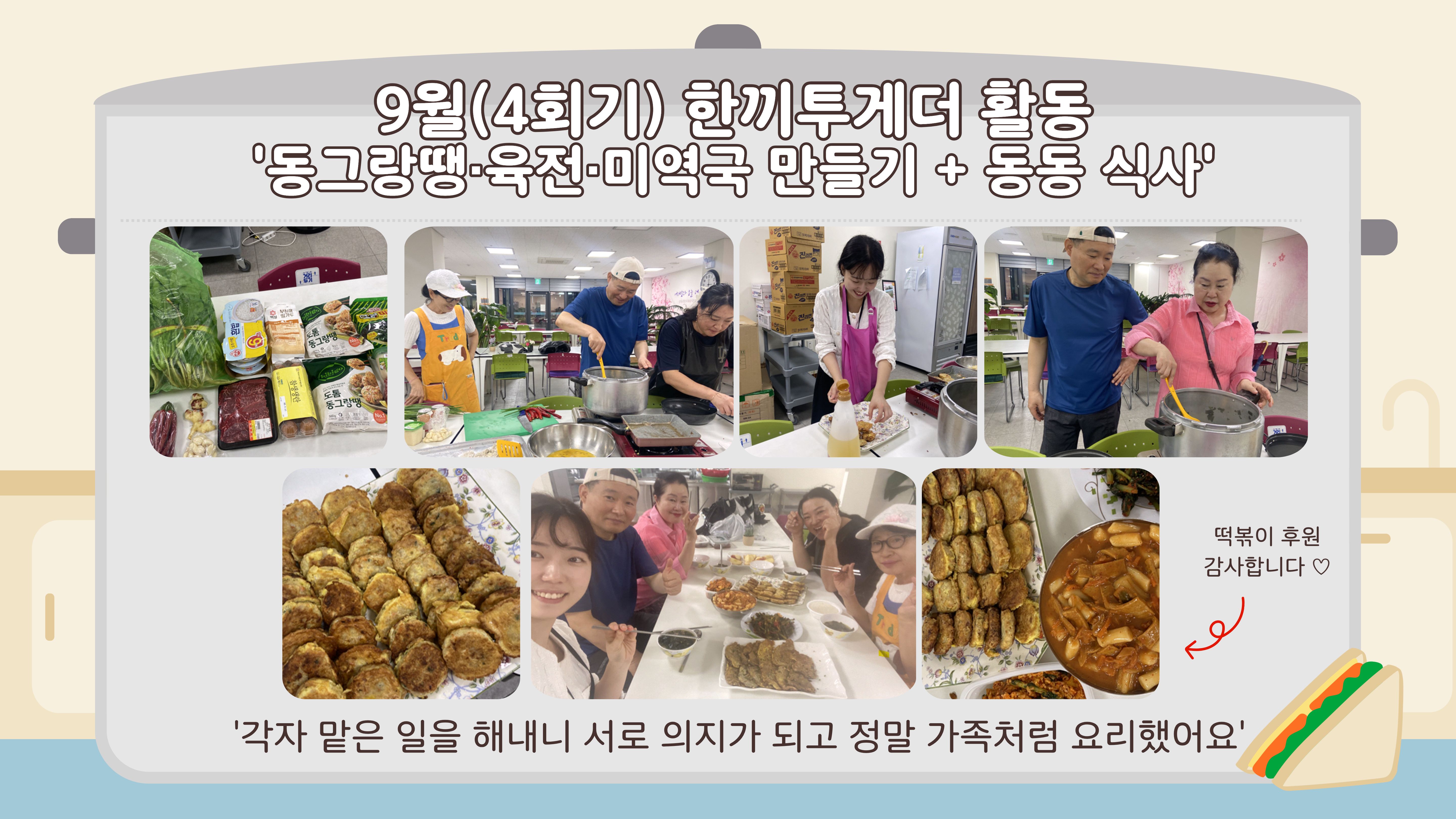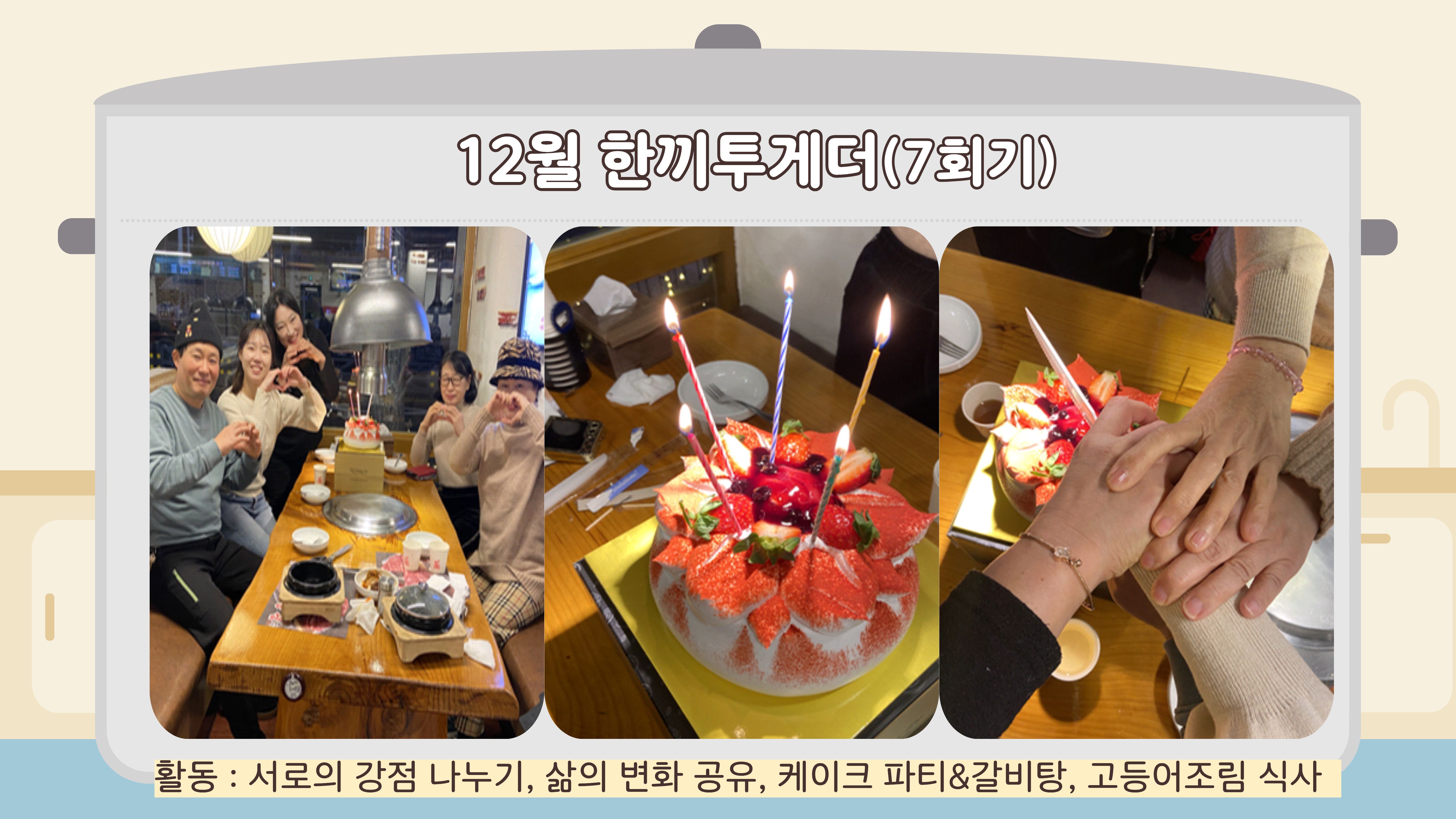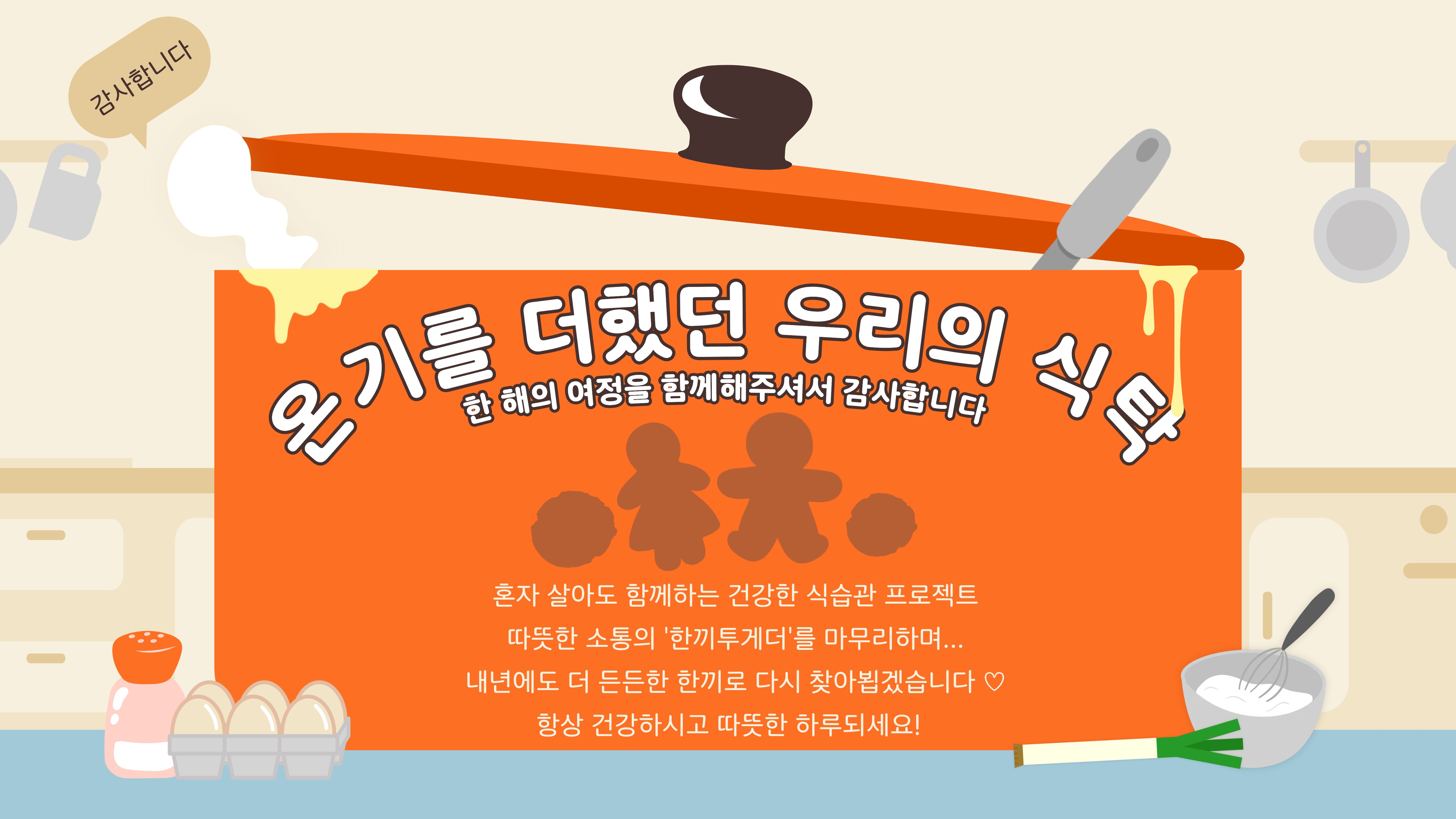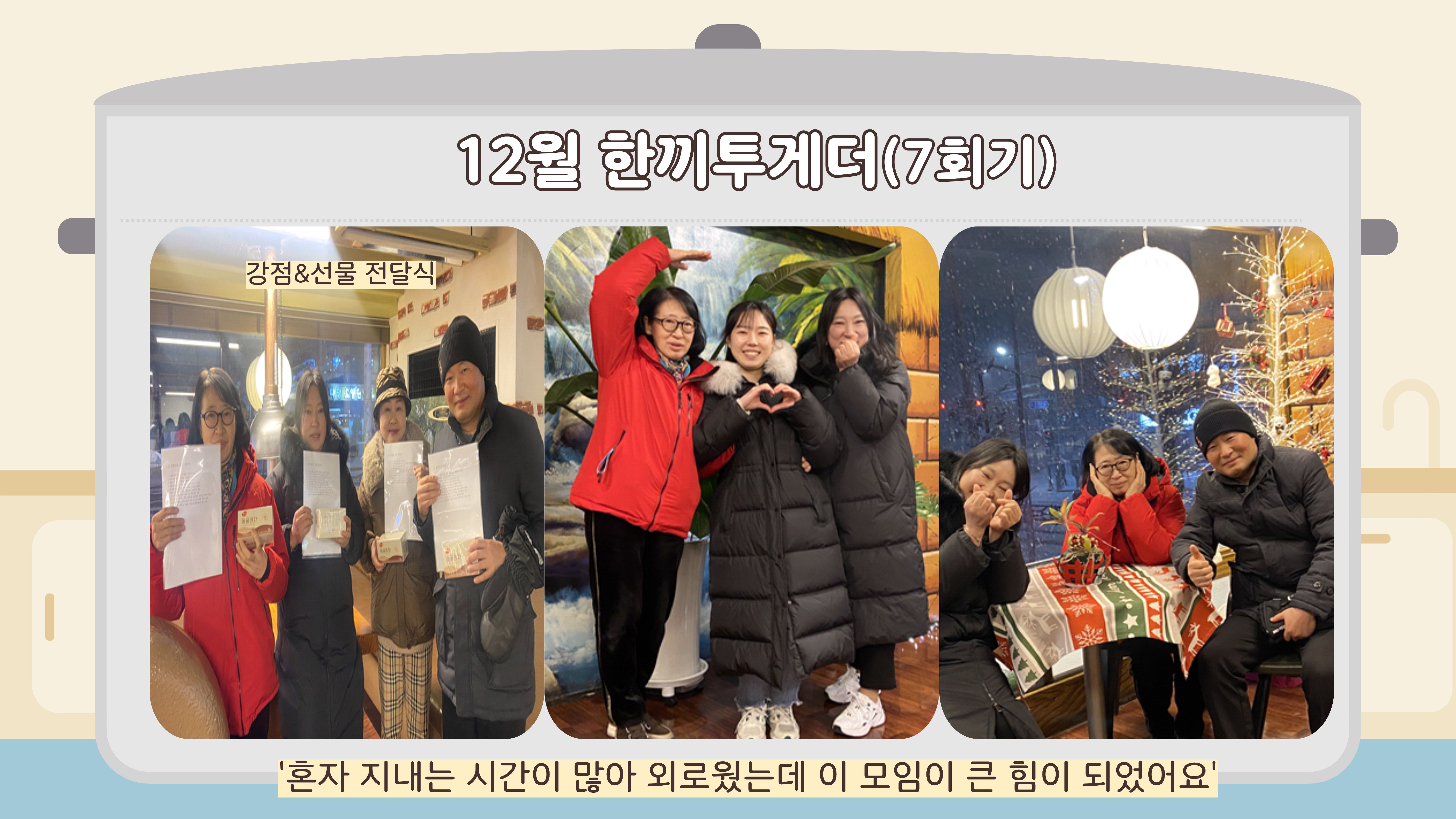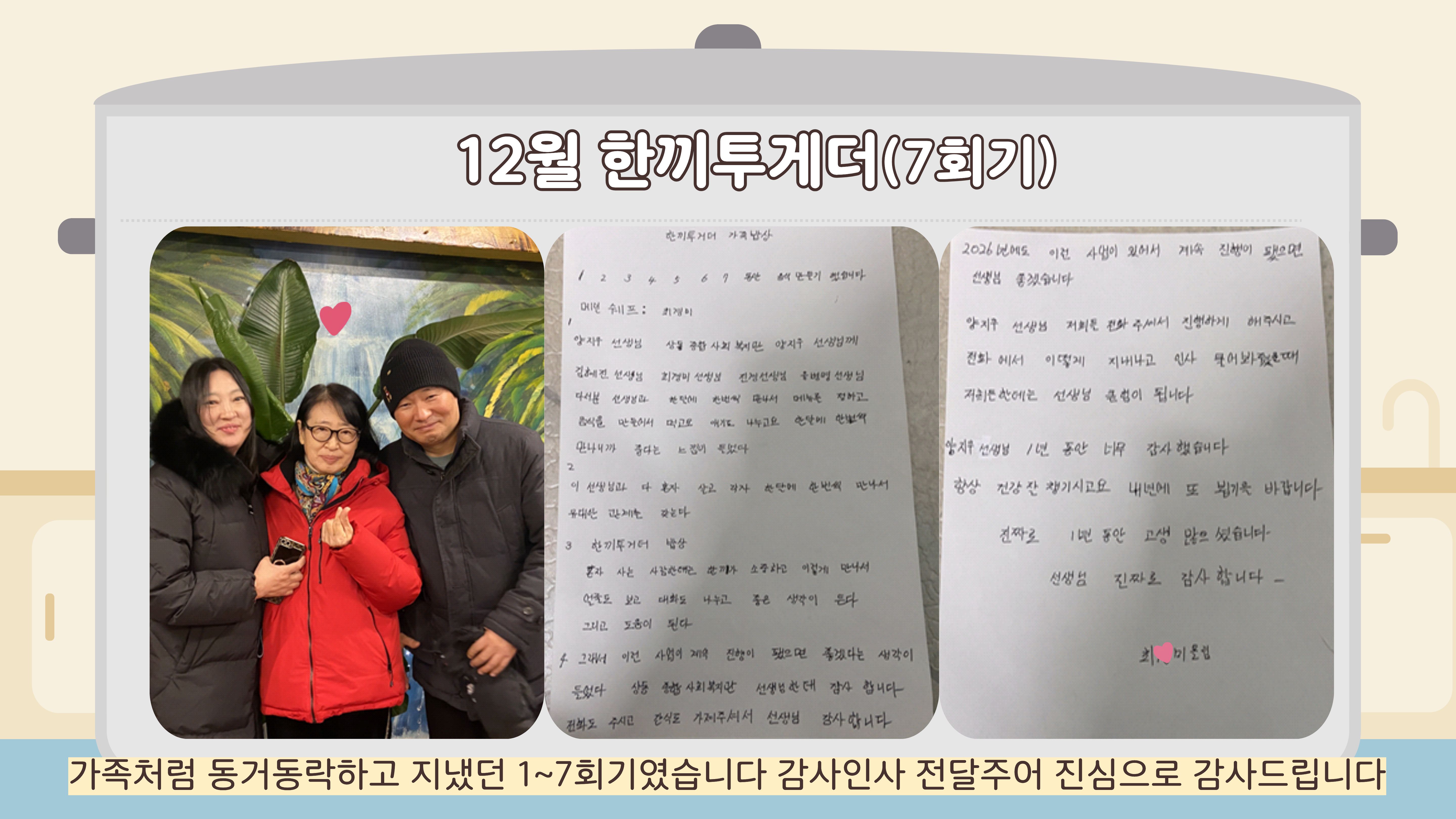 올해 함께해 주신 모든 분들께 진심으로 감사드리며 앞으로도 여러분의 하루가 든든하고 따뜻하길 응원합니다. 다음 한끼투게더에서도 다시 만나기를 기대합니다 문의 : 양지우 사회복지사 032-252-0644