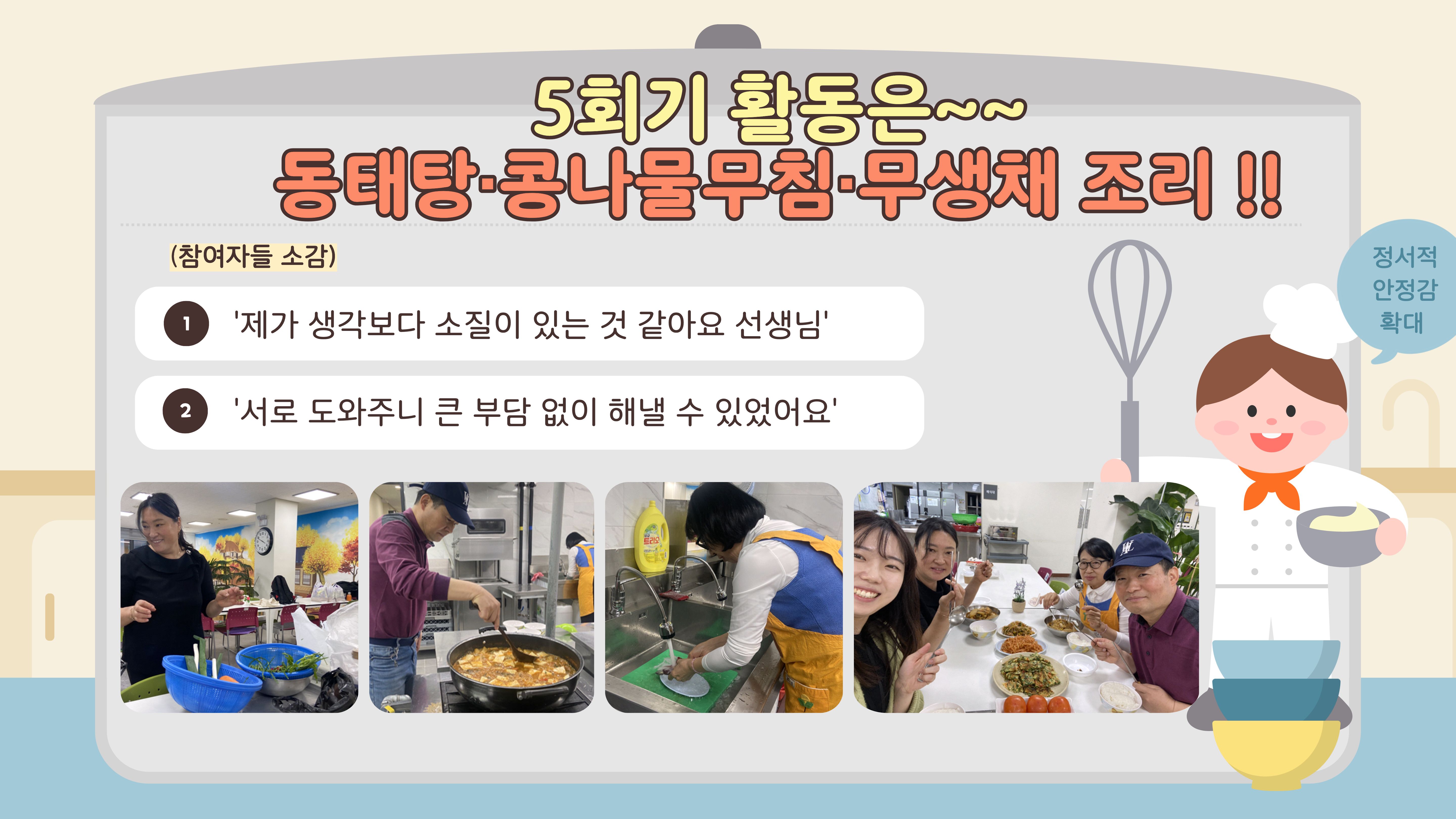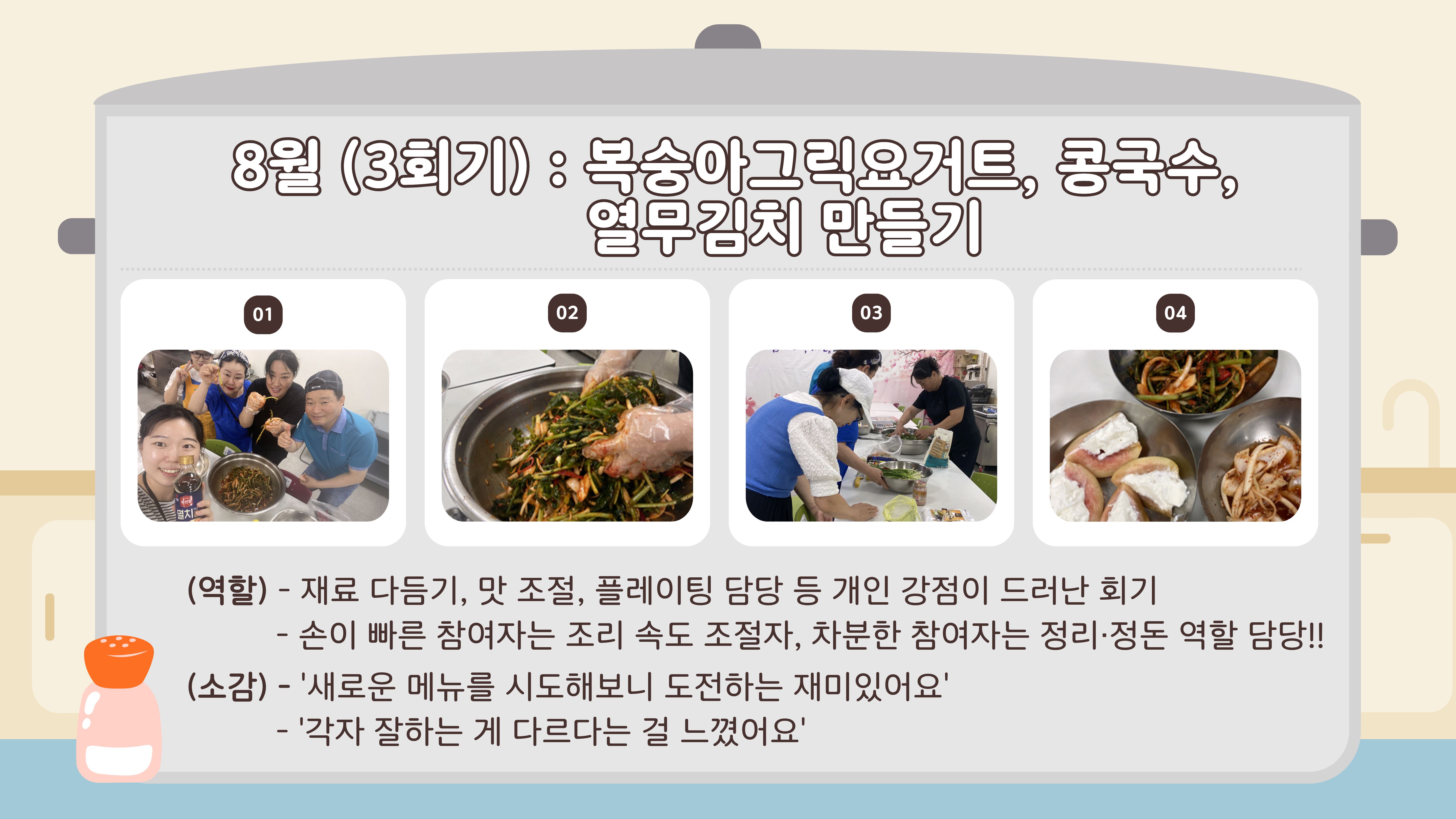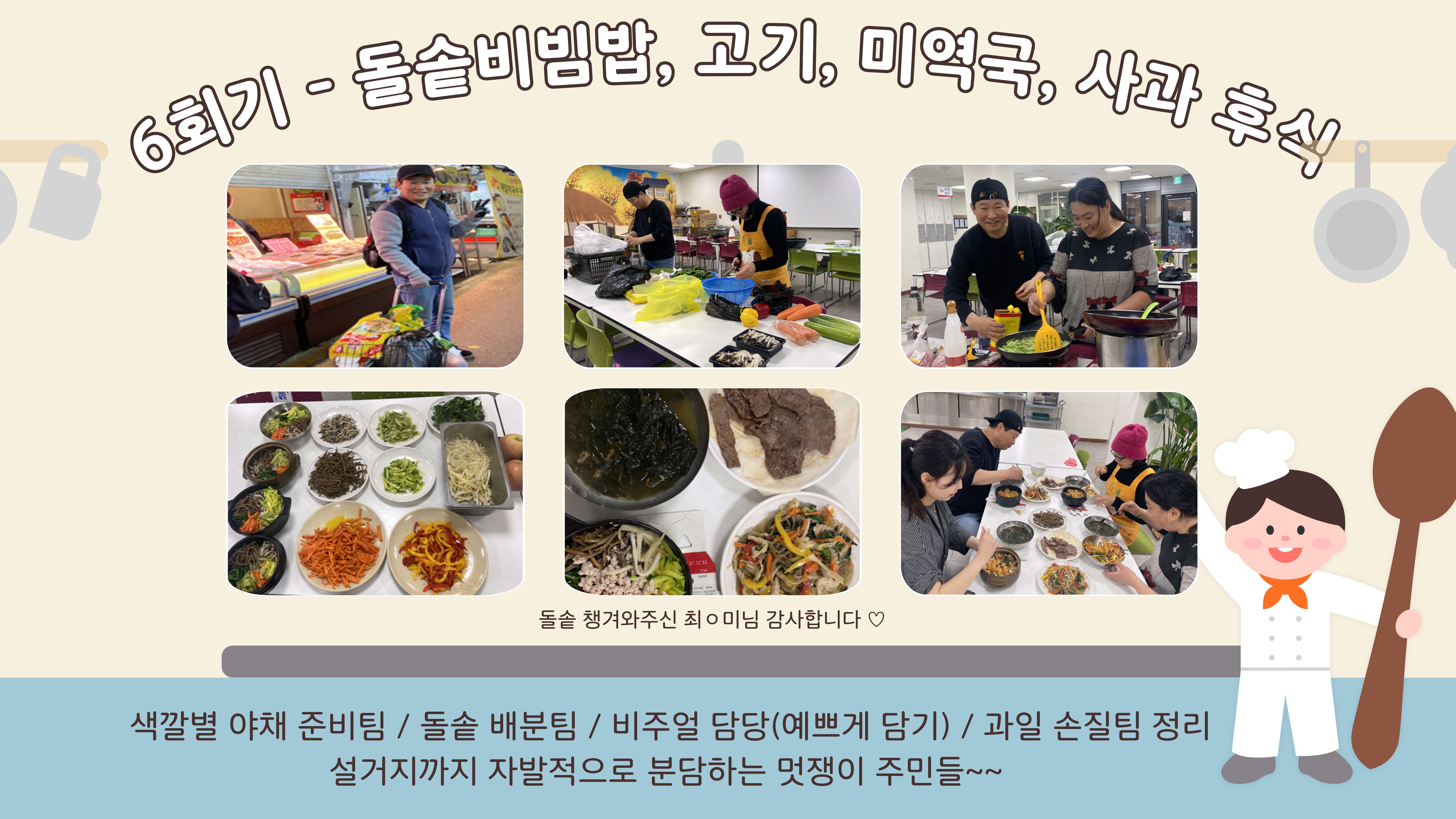 처음 만났던 1회기에는 서로를 소개하며 조심스러운 첫 인사를 나눴고 식사를 함께하며 자연스럽게 마음이 열리기 시작했습니다. 이후 회기가 거듭될수록 참여자들은 각자의 역할을 맡아 재료 손질부터 조리, 테이블 세팅까지 협력하며 ‘같이 먹는 한 끼’의 의미를 몸으로 느껴갔습니다.