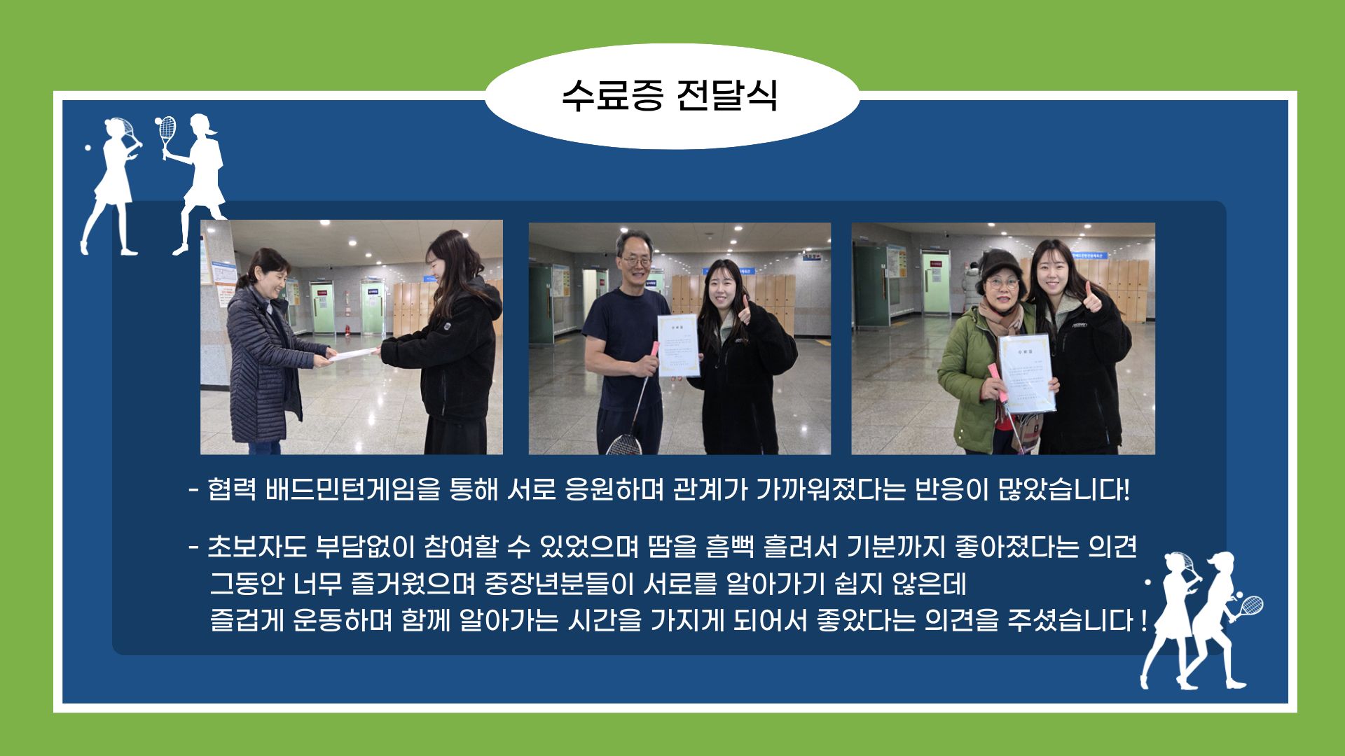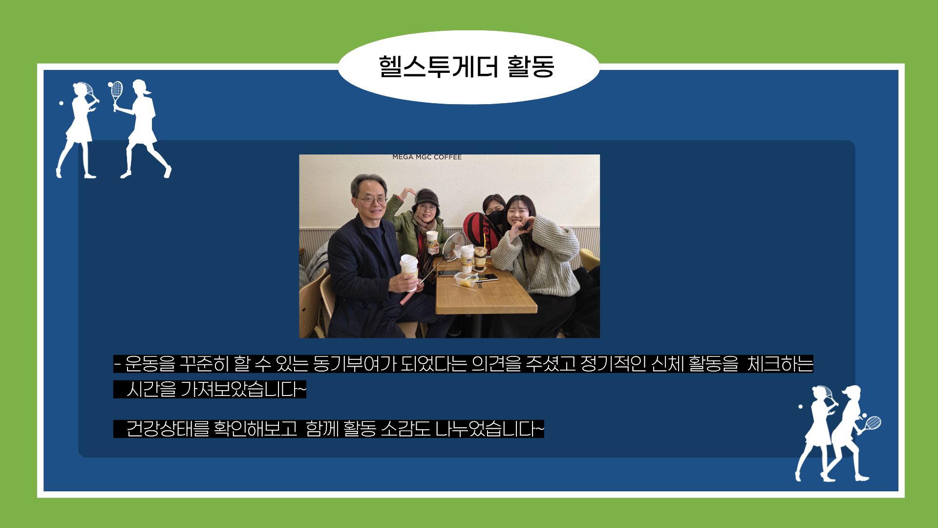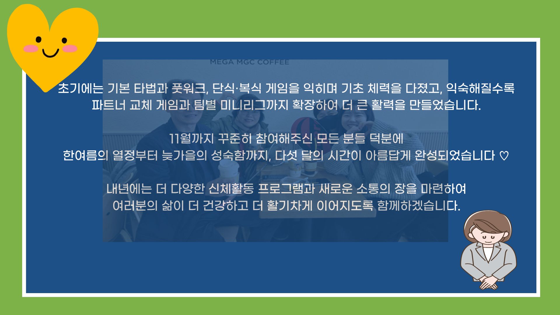 혼자 사는 중·장년이라도 함께 운동하고 소통하며 충분히 행복할 수 있다는 사실을 이번 활동을 통해 다시 한 번 확인할 수 있었습니다.