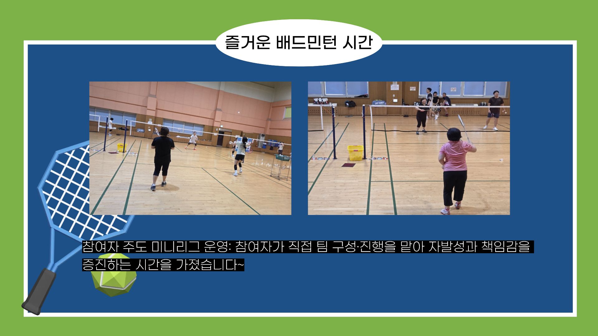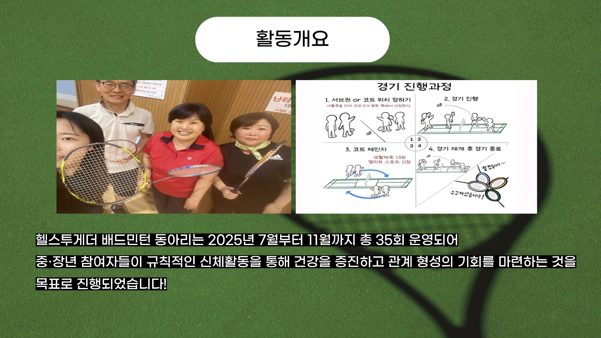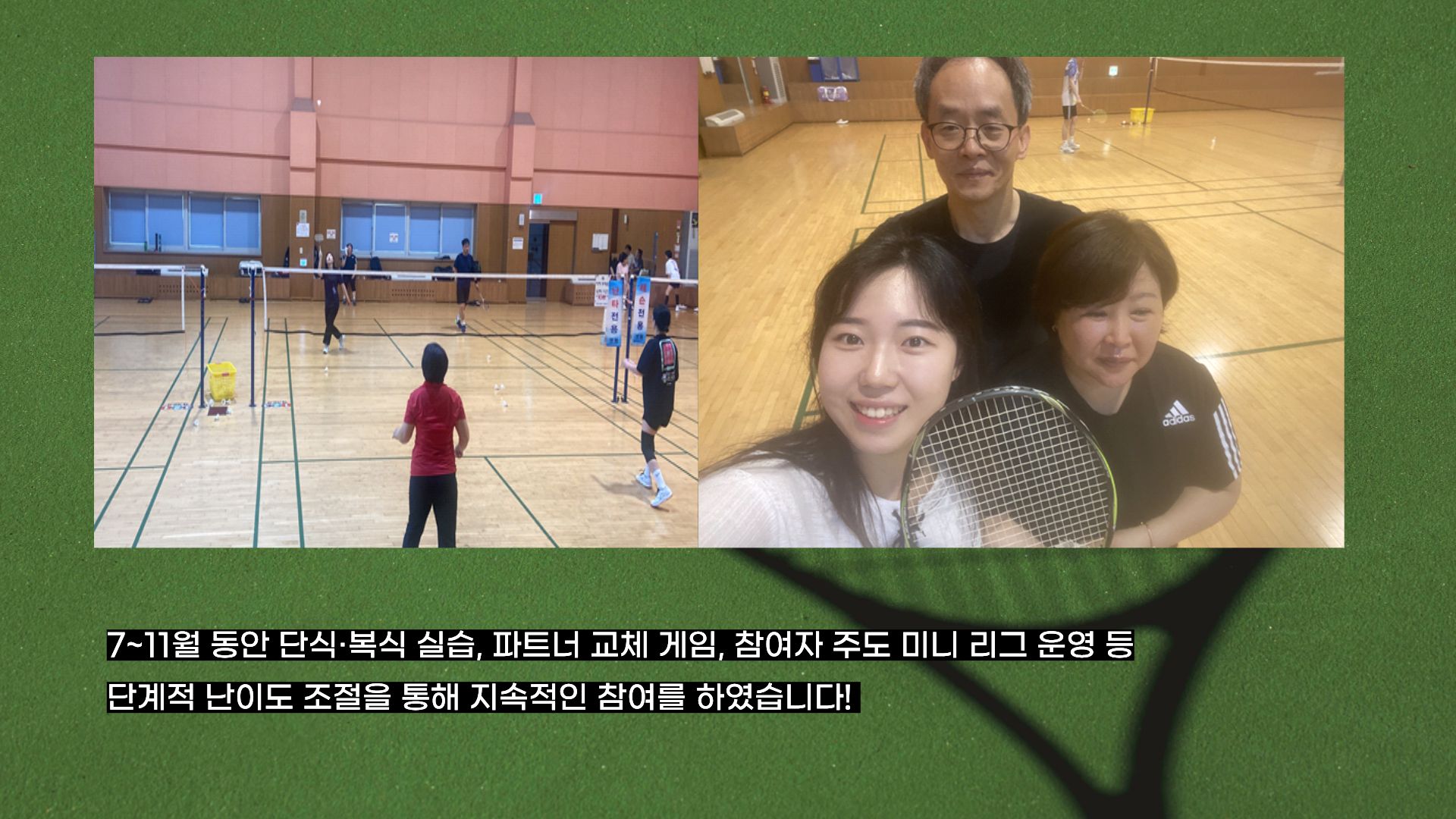 헬스투게더 배드민턴 동아리의 7월부터 11월까지의 모든 일정이 성황리에 마무리되었습니다.