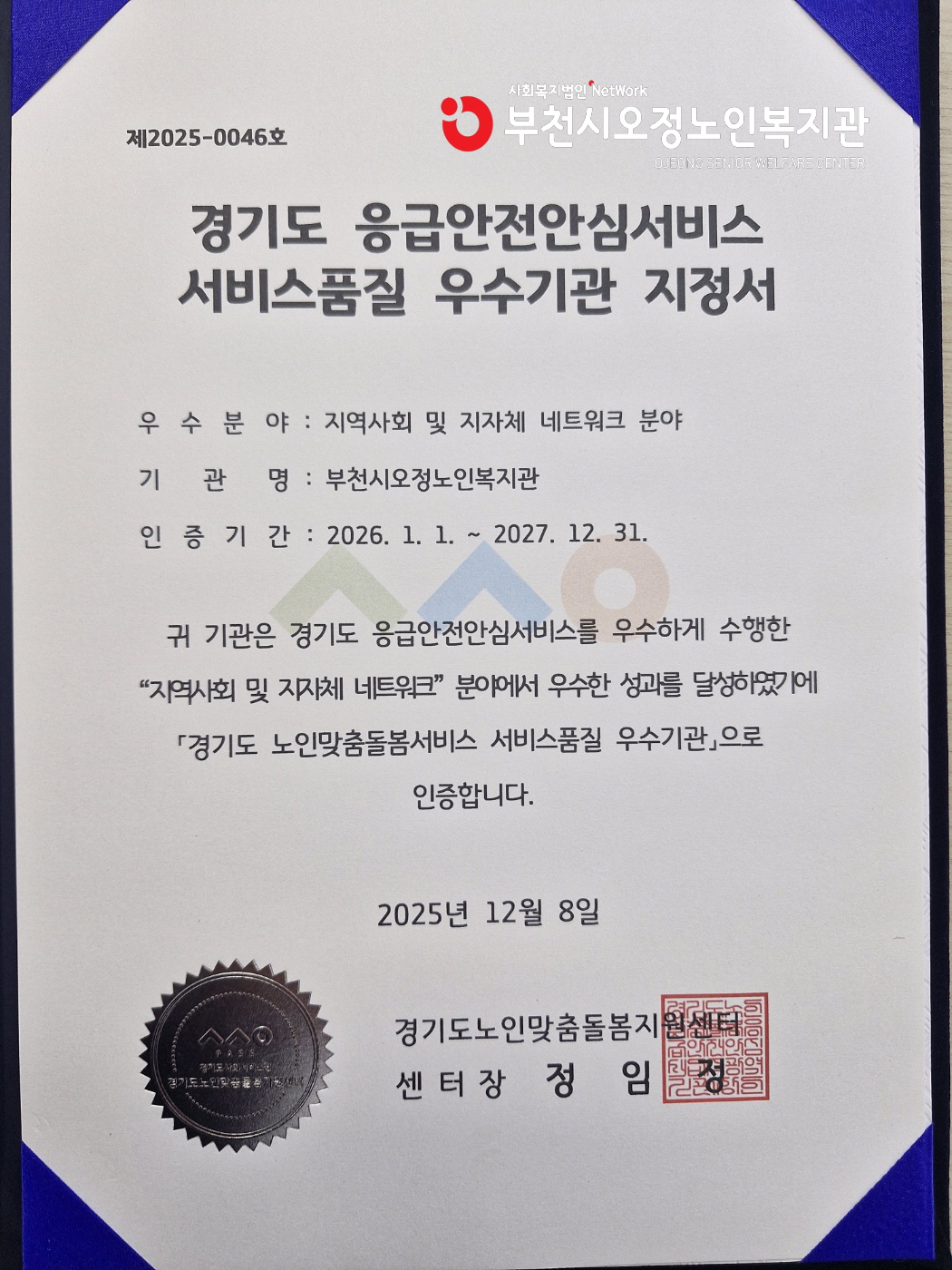 부천시오정노인복지관은 2025년 경기도 내 35개 수행기관 중 응급안전안심서비스를 우수하게 수행하여 “지역사회 및 지자체네트워크” 분야에서 뛰어난 성과를 인정받아 경기도 노인맞춤돌봄서비스 서비스품질 우수 수행기관으로 선정되었다.