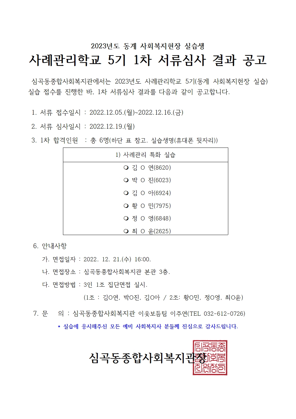 2023년도 사례관리학교 5기(동계 사회복지현장실습)실습생 1차 서류심사 결과