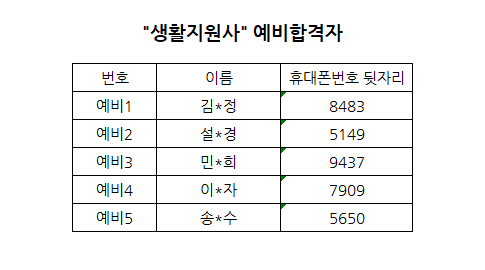● 합격자 명단은 가나다 순이며, 개인정보보호를 위해 가운데 이름은 *처리하였으며, 합격자 확인은 휴대폰 뒷자리 번호로 확인하시기 바랍니다.