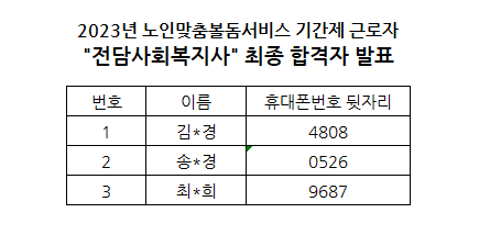 부천시소사노인복지관 2023년 노인맞춤돌봄서비스 기간제근로자(전담사회복지사, 생활지원사) 최종합격자를 아래와 같이 공고합니다.