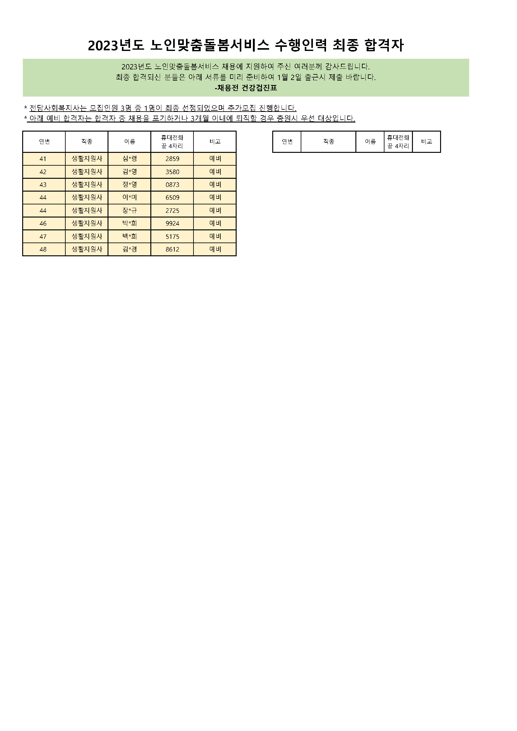 2023년도 노인맞춤돌봄서비스 수행인력 채용 최종결과 안내