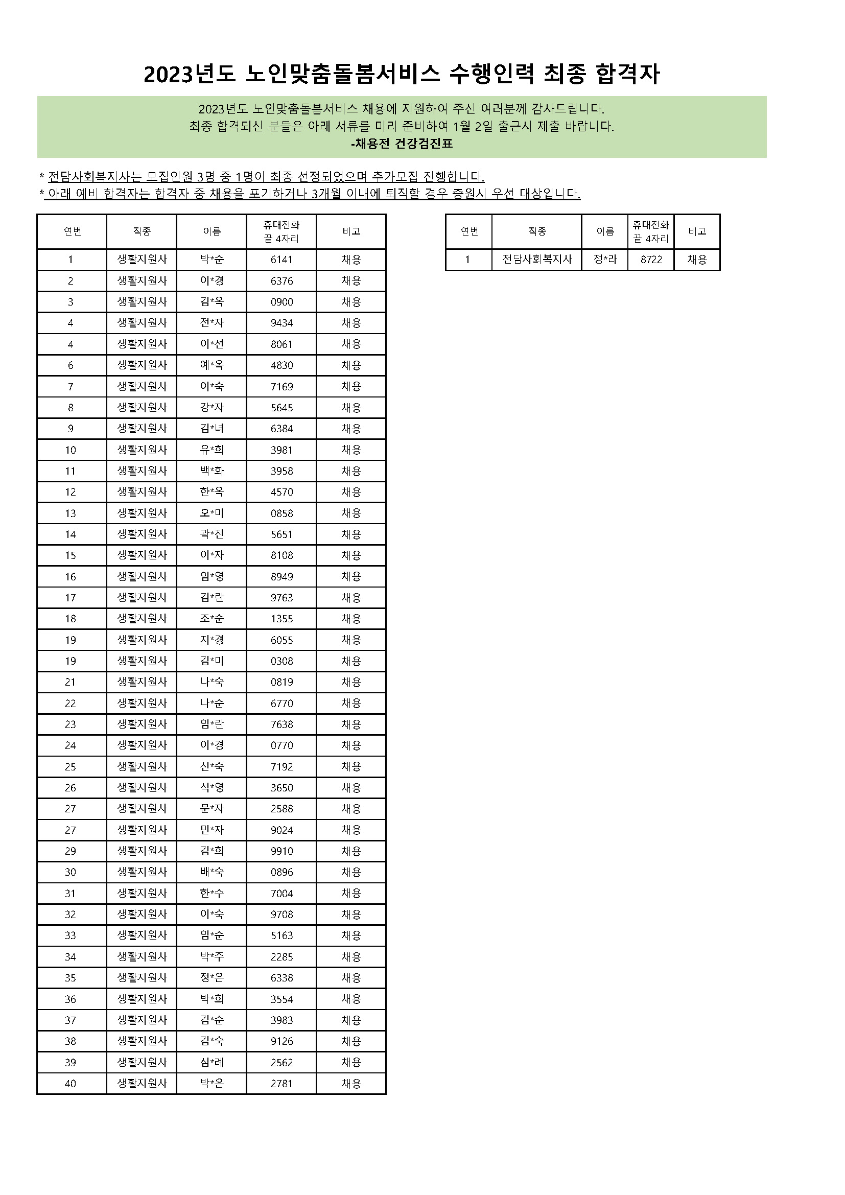 합격자 공지)2023년 노인맞춤돌봄서비스 기간제 근로자...