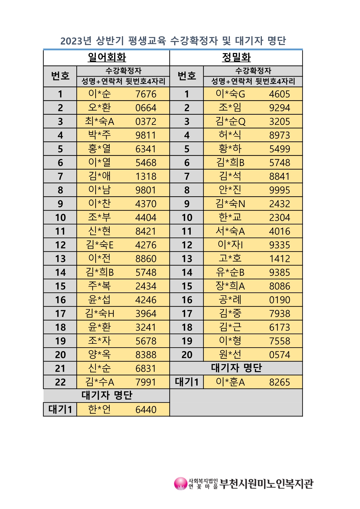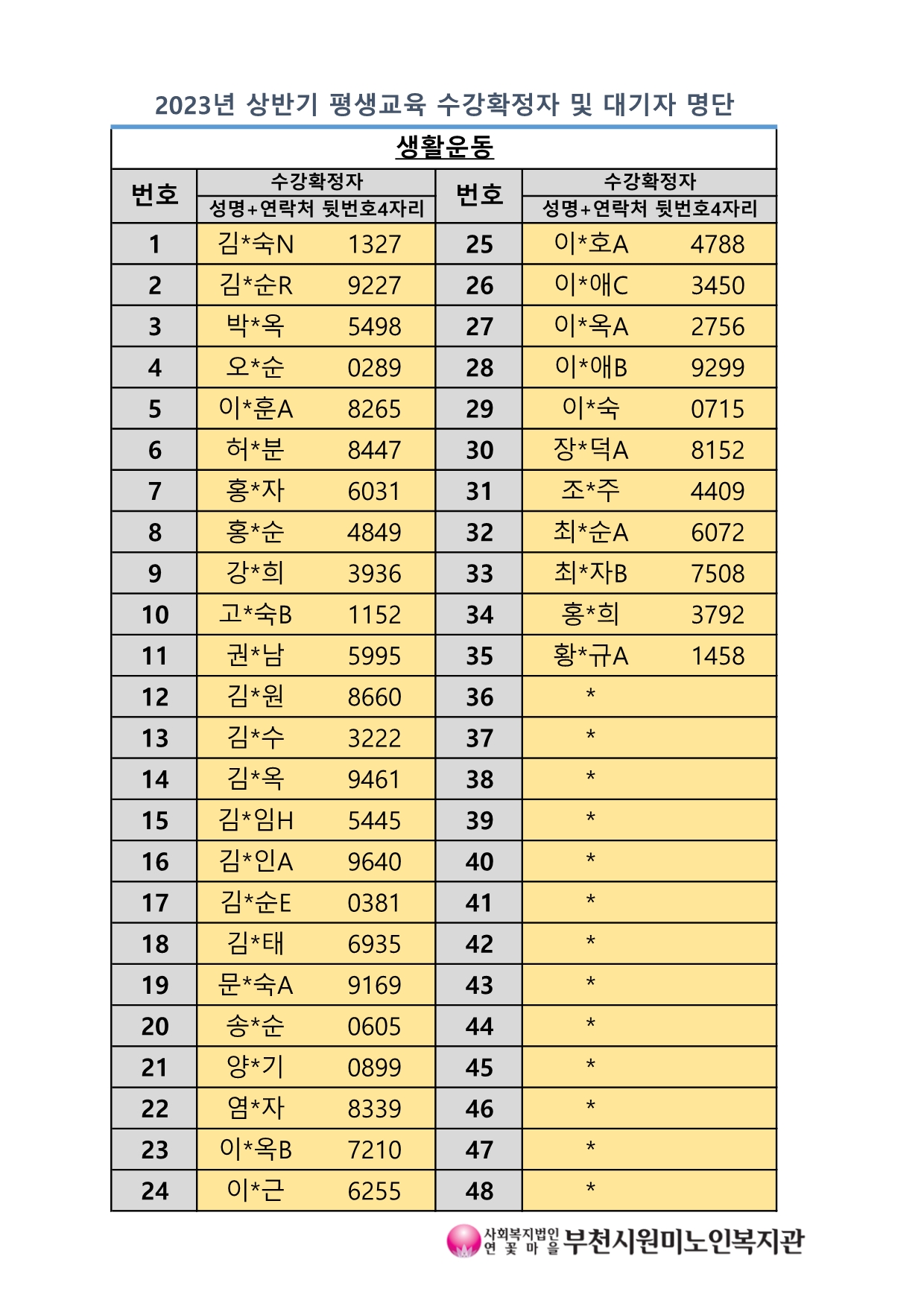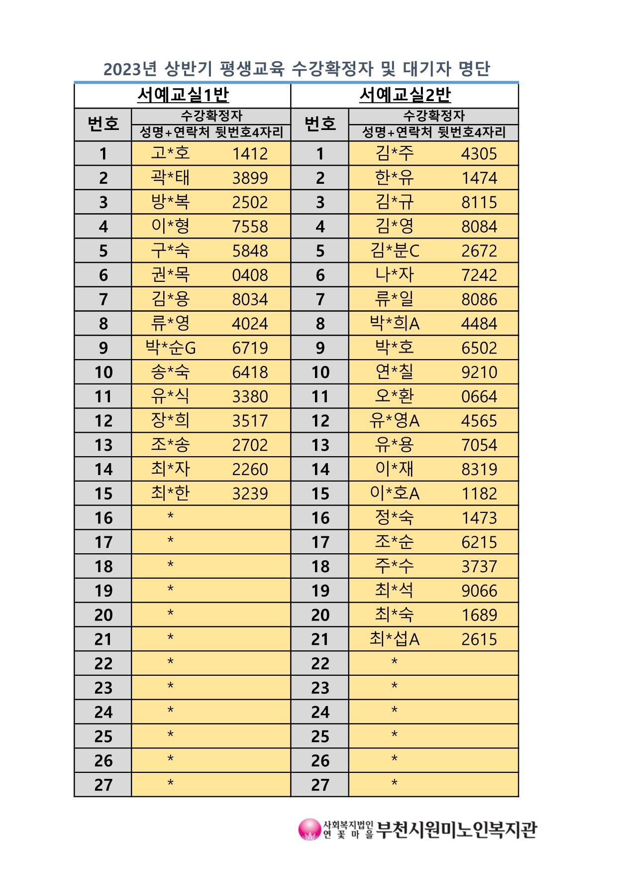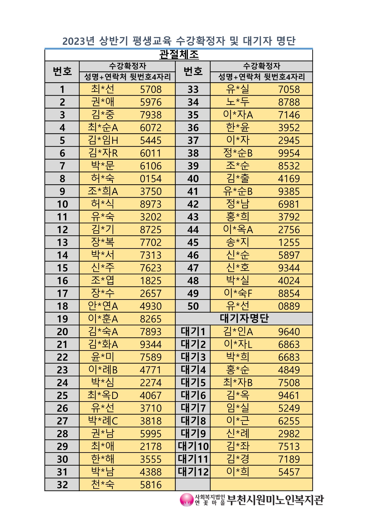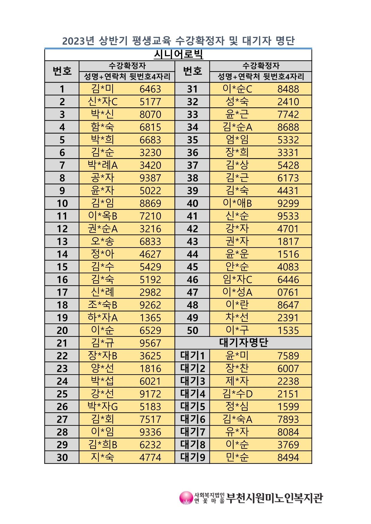 [부천시원미노인복지관] 2023년 상반기 평생교육 프로그램 추첨결과 공지