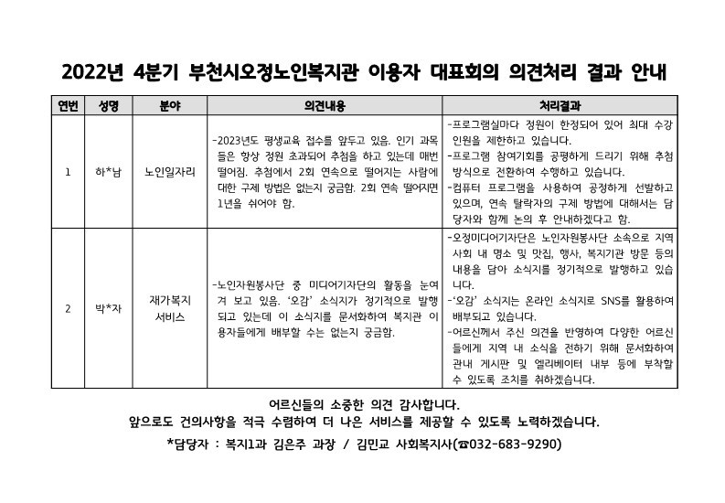 2022년 4분기 부천시오정노인복지관 이용자 대표회의 의견처리 결과 안내