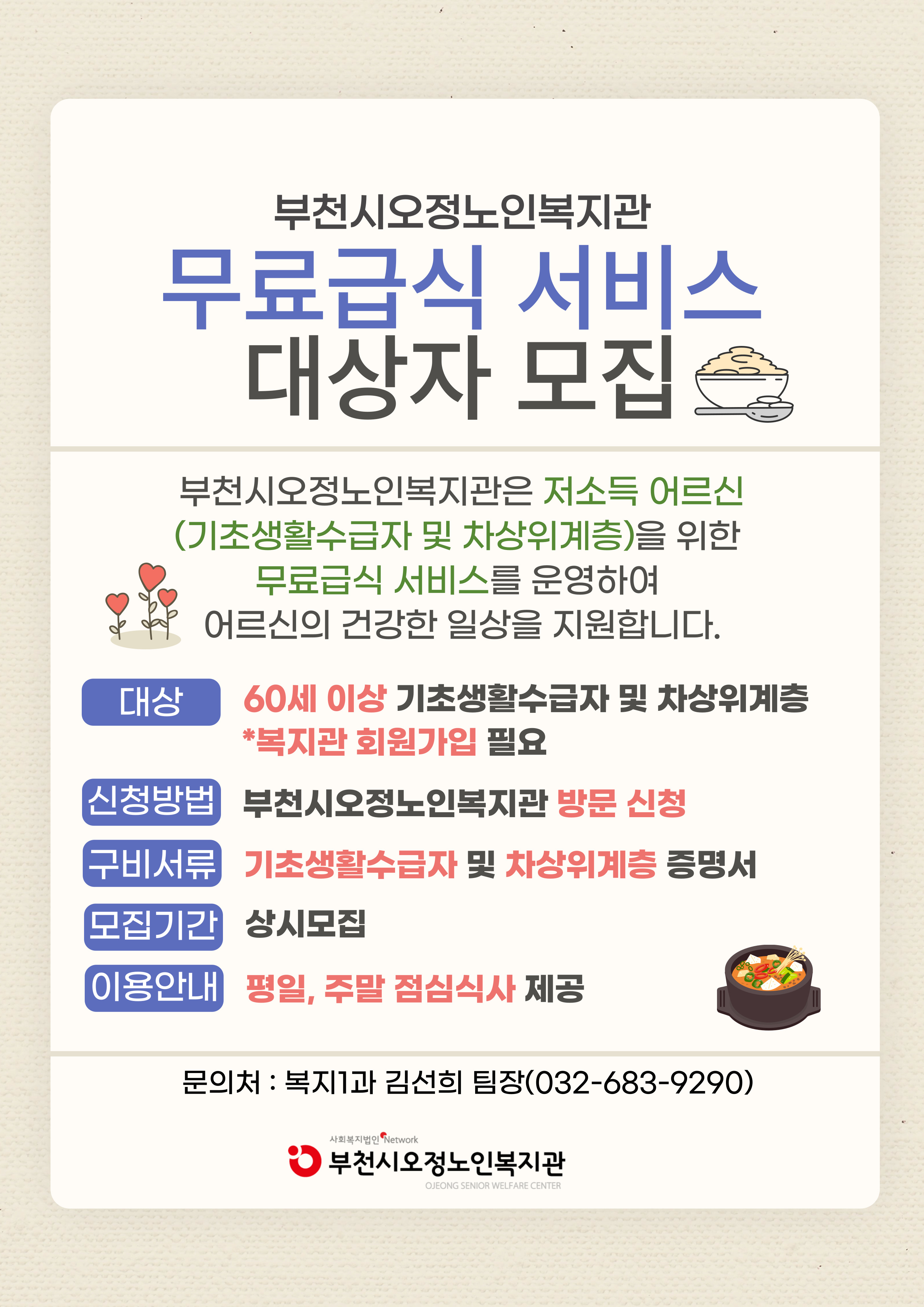 부천시오정노인복지관 무료급식 대상자 모집
