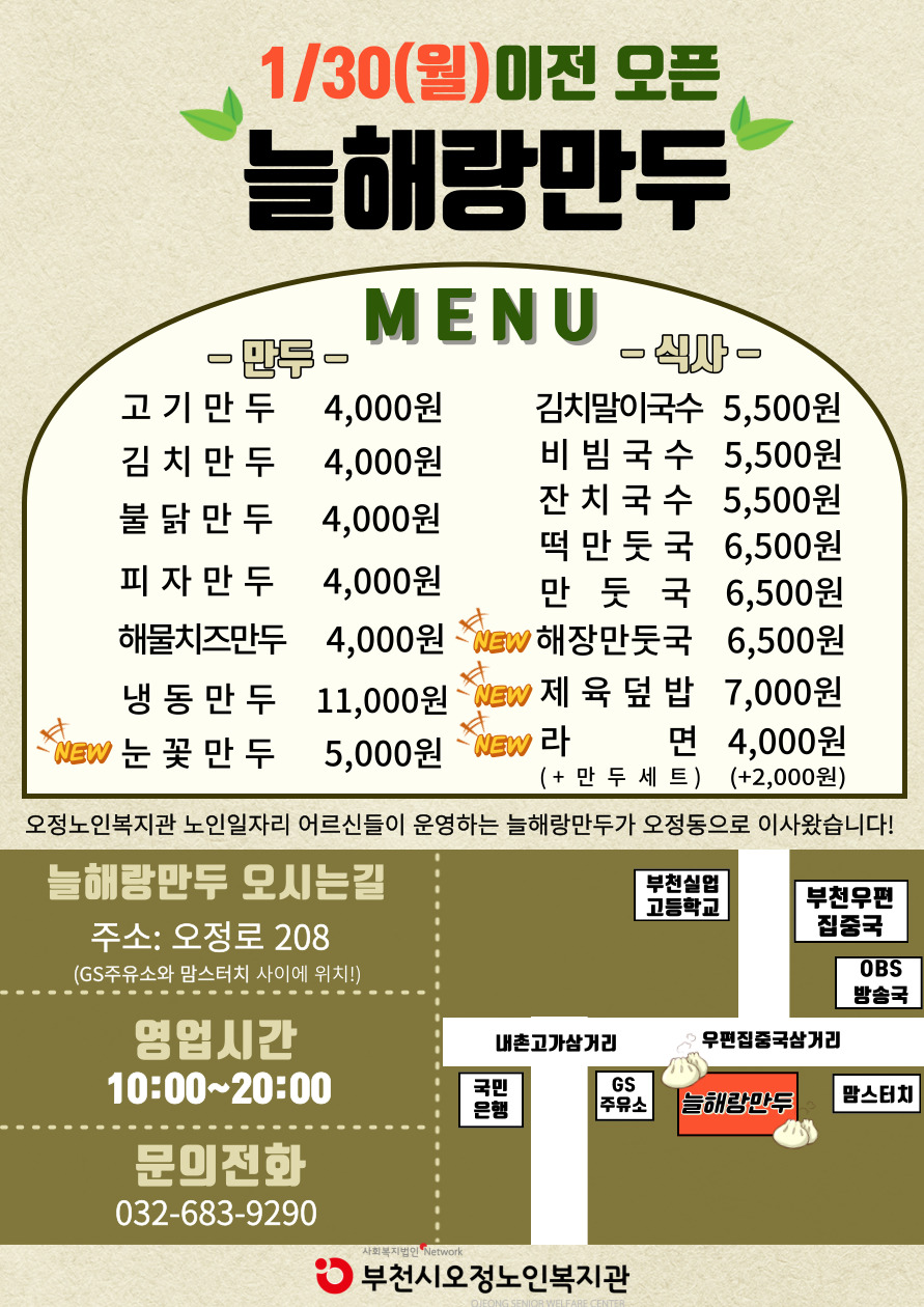부천시오정노인복지관 '늘해랑만두' 매장 이전 오픈 안내