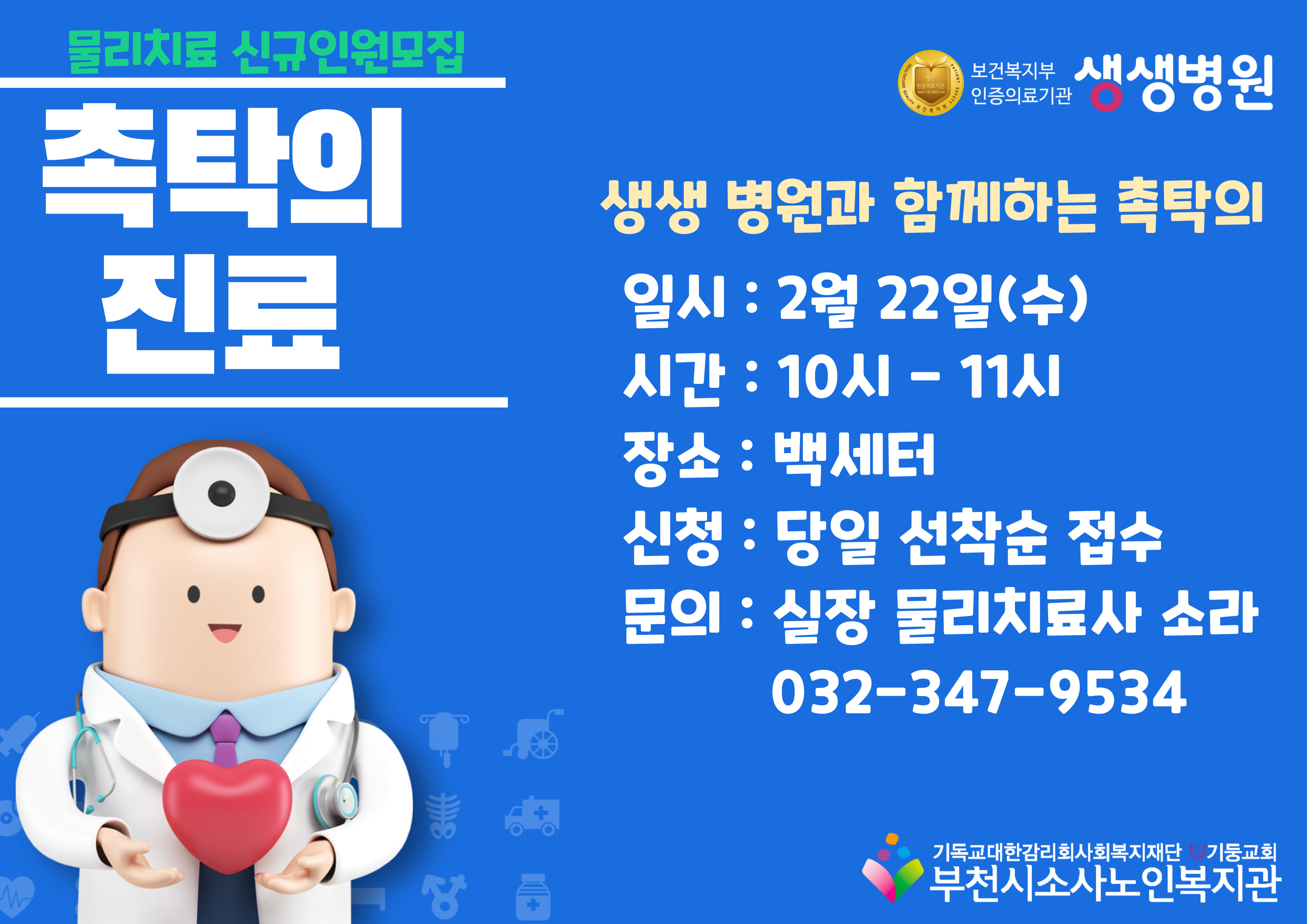 백세터에서 당일 선착순 접수로 2월 22일(수) 10시 –11시 진행되며 자세한 사항은 실장 물리치료사 소라 032-347-9534에게 문의하시기 바랍니다.