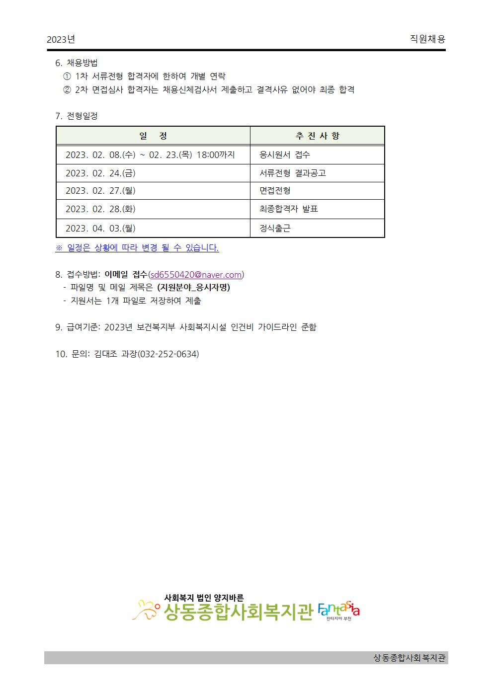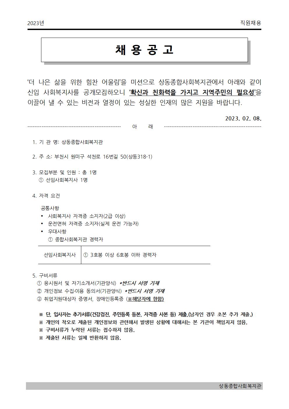 [상동] 2023년 상동종합사회복지관 사회복지사 채용 공고
