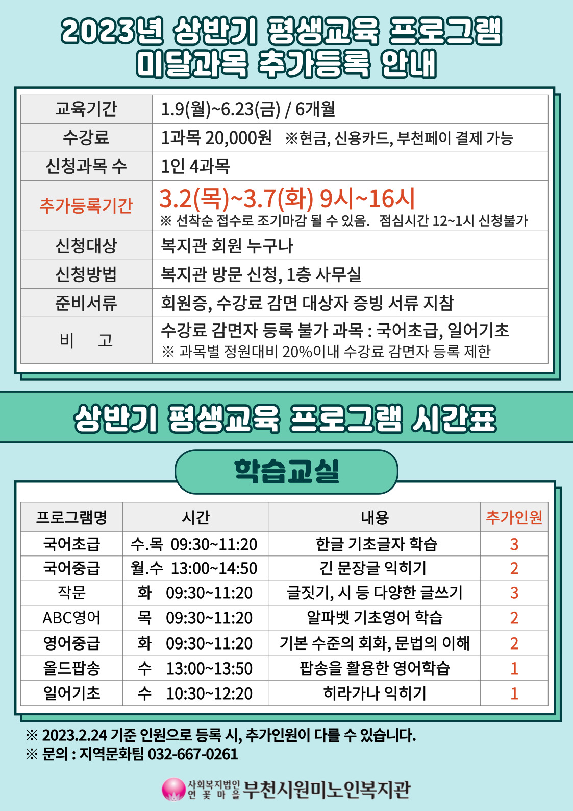 2023년 상반기 평생교육 프로그램 미달과목 추가등록 안내