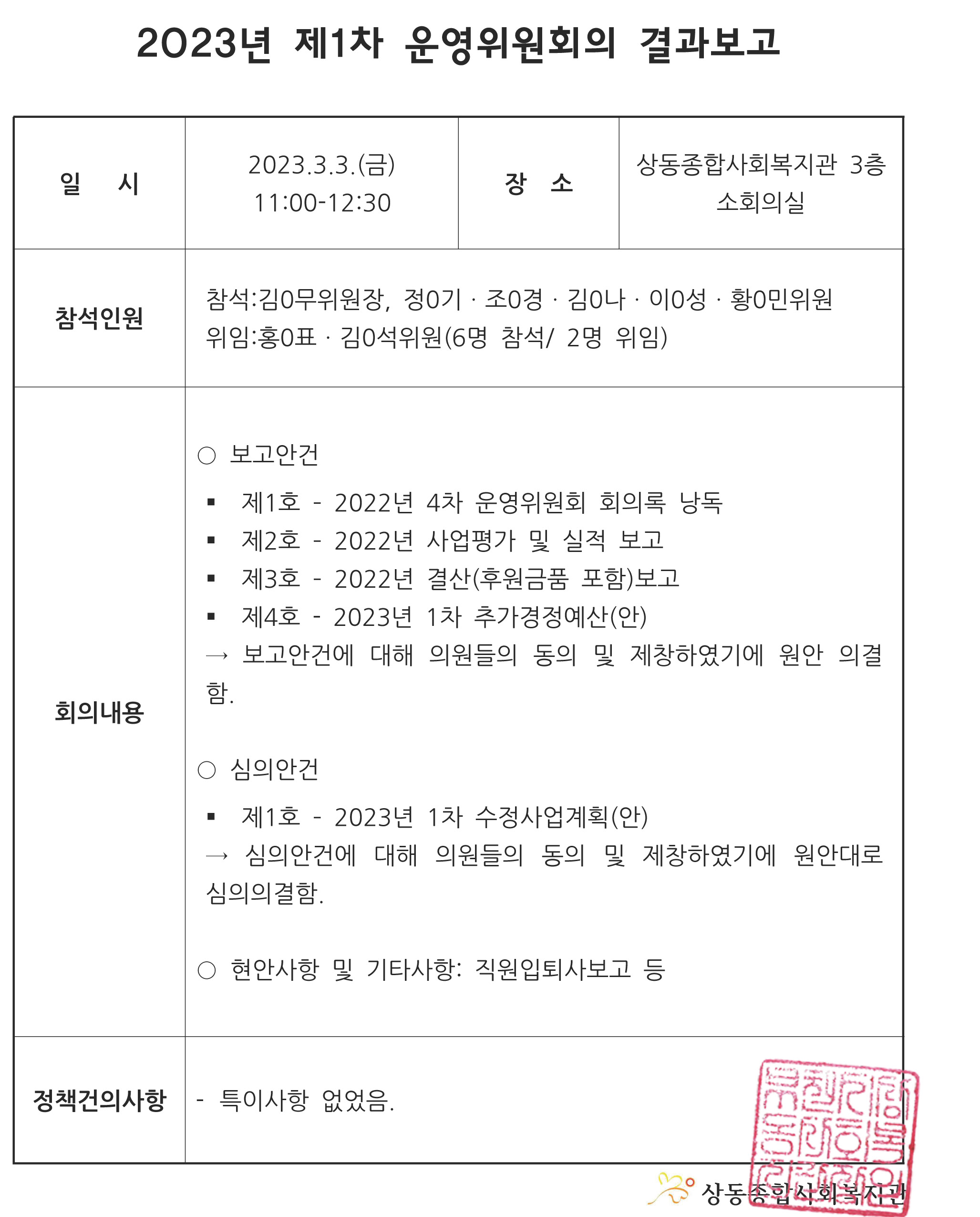 2023년도 상동종합사회복지관 제 1차 운영위원회의 결과 공고