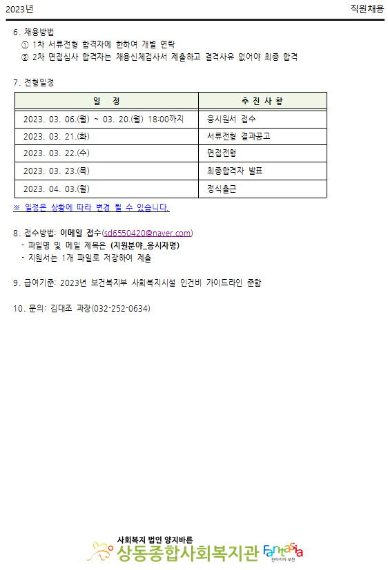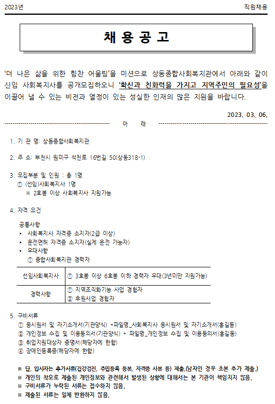 2023년 상동종합사회복지관 사회복지사 채용 공고