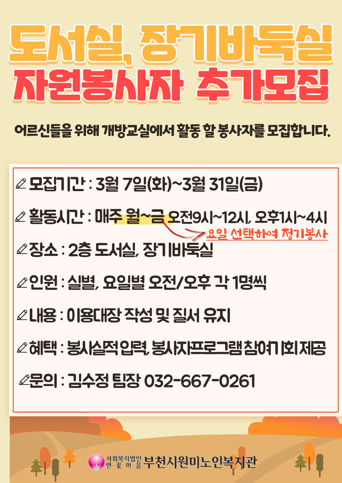 복지관 개방교실인 도서실, 장기바둑실에서 활동하실 봉사자를 모집합니다.