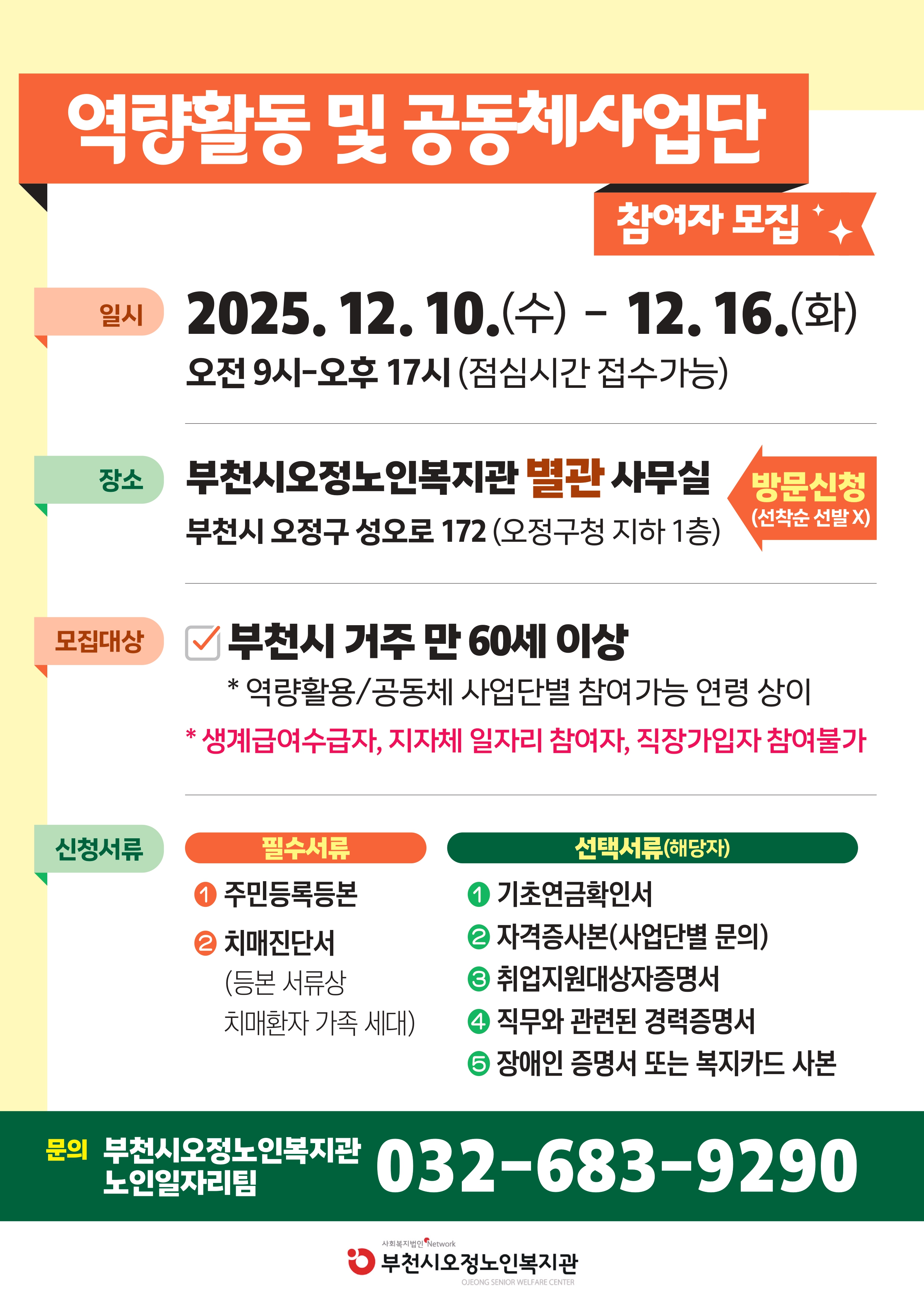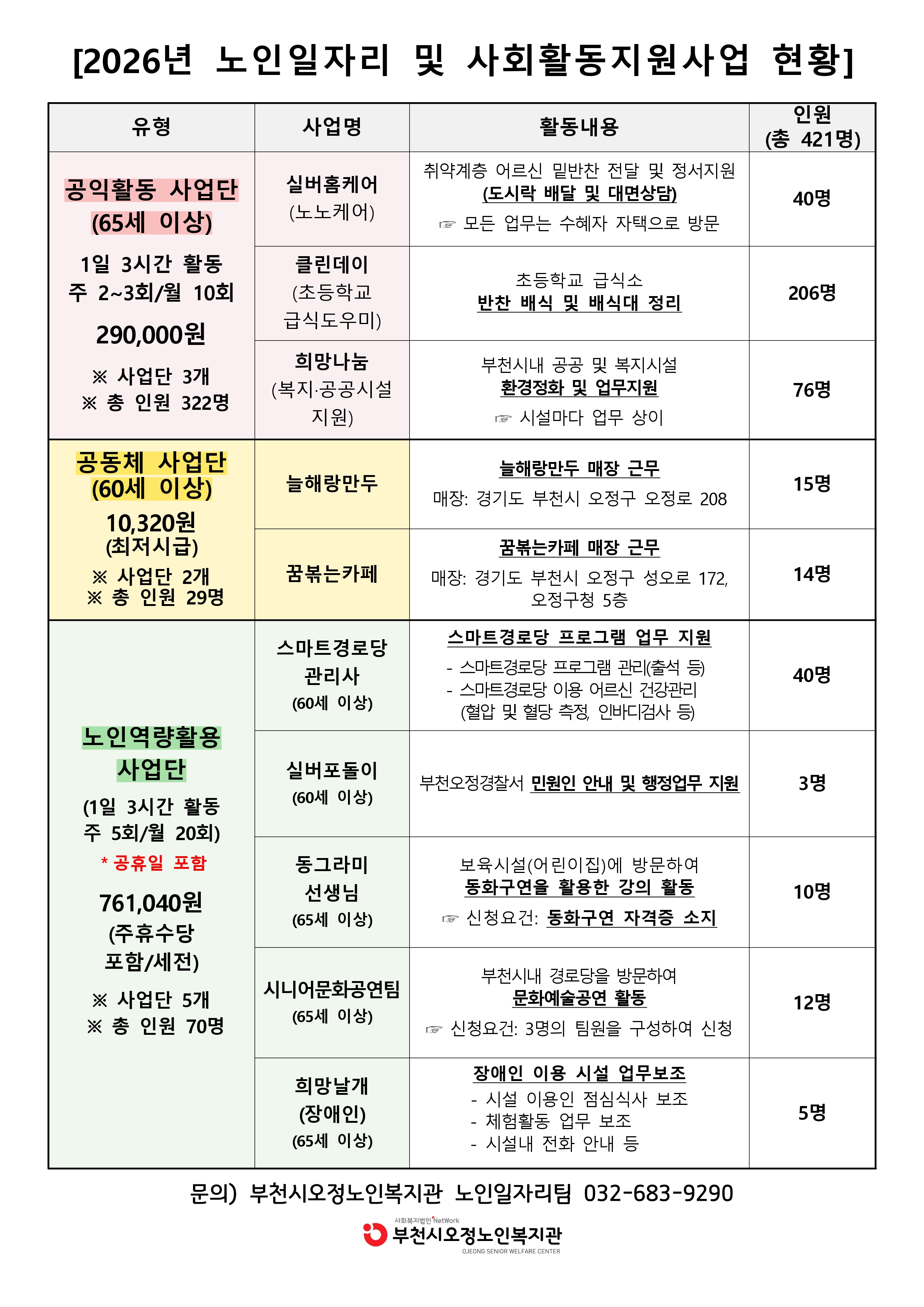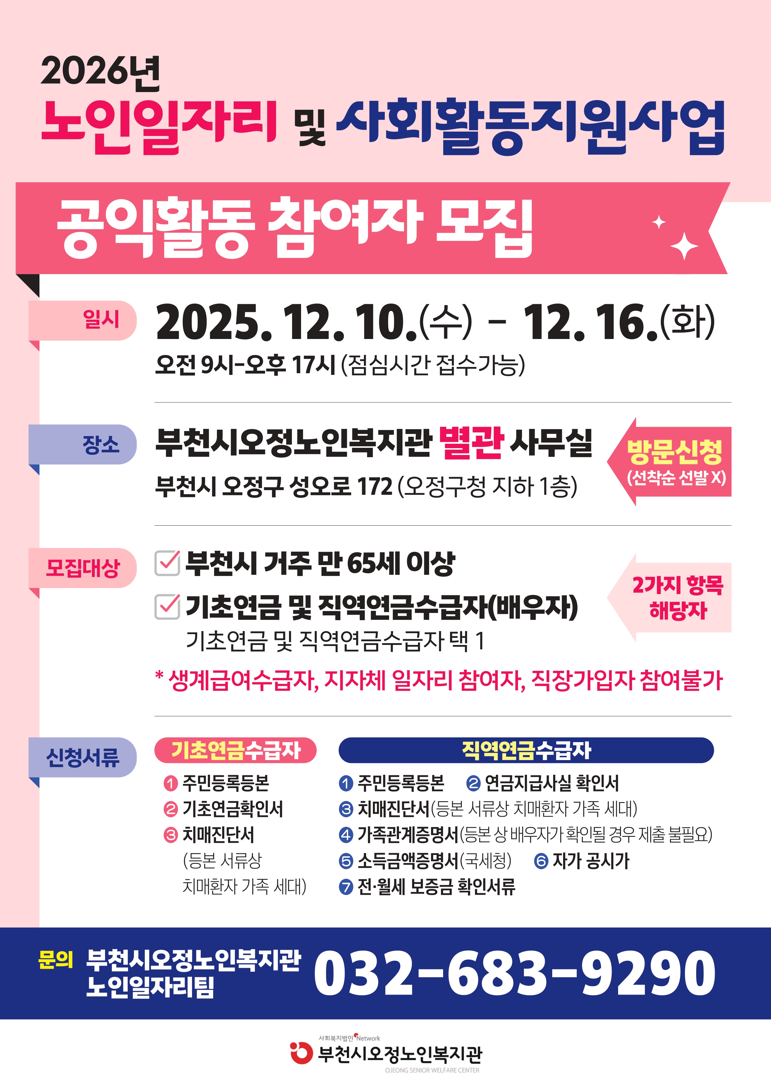 2026년 부천시오정노인복지관 노인일자리 및 사회활동지원사업 참여자 모집 공고