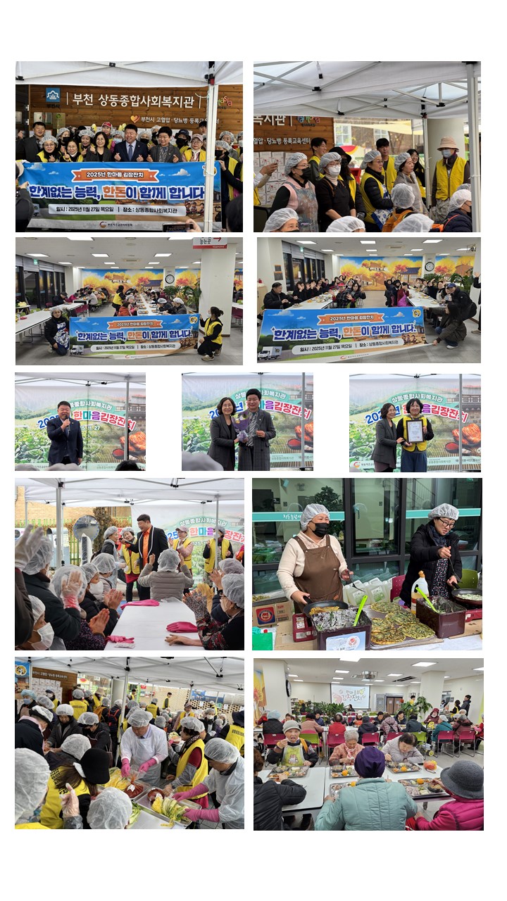 상동종합사회복지관[관장 정성기]은 2025년 11월 27일 상동복지관에서 노인맞춤돌봄서비스 이용 어르신과 생활지원사, 직원, 봉사자들과 함께 주변의 어려운 이웃에게 전달할 한마음김장잔치를 열었다.