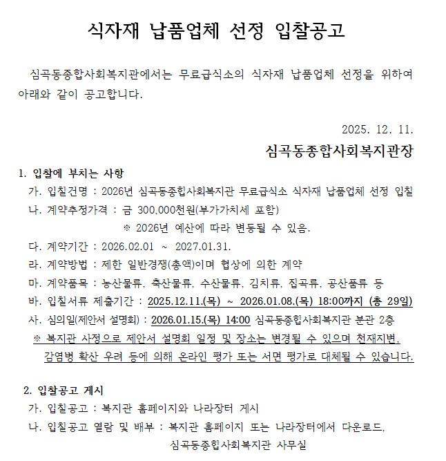 2026 심곡동종합사회복지관 식자재 납품업체 선정입찰