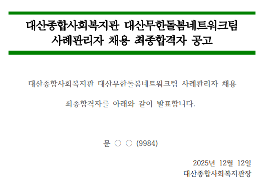 대산종합사회복지관 대산무한돌봄네트워크팀 사례관리자 채용 최종합격자 공고